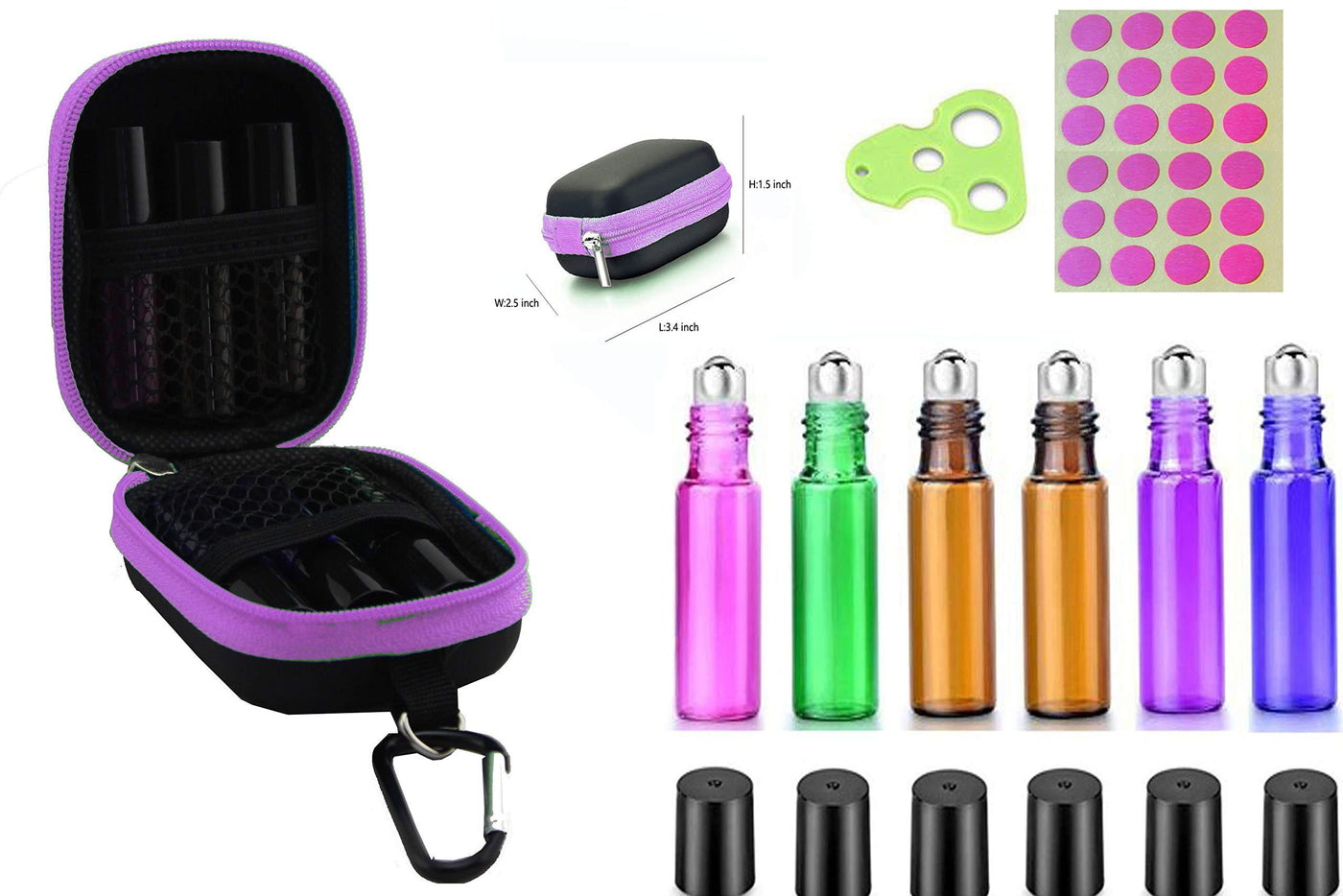 Premium 6 Pack 5ML Roller Bottles With 1X Essential Oil Carrying Case Perfects For Purse Travel 1PCS Opener Key Tool Some Blank lables (Purple)