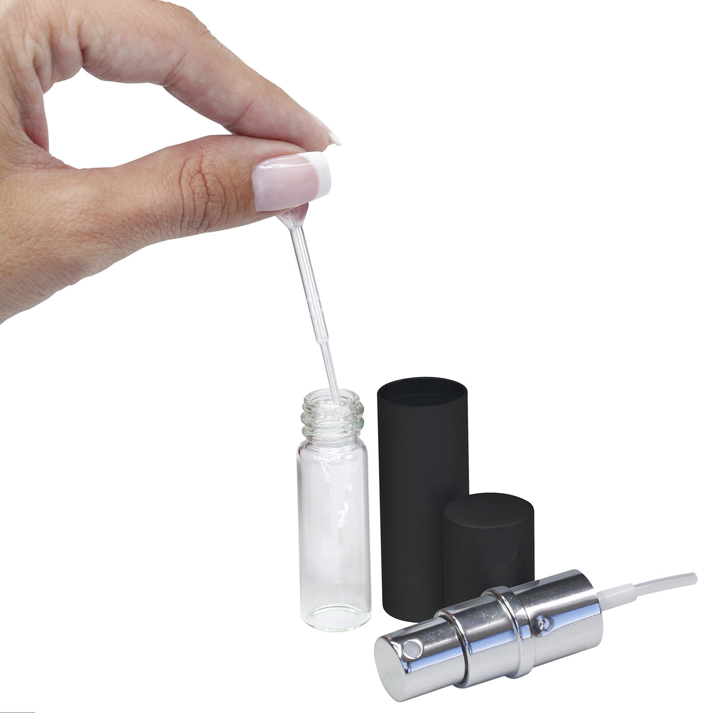 Refillable Perfume & Cologne Fine Mist Atomizers with Metallic Exterior & Glass Interior - 5ml Portable Travel Size - 3ml Squeeze Transfer Pipette Included (3 Pack, Black)