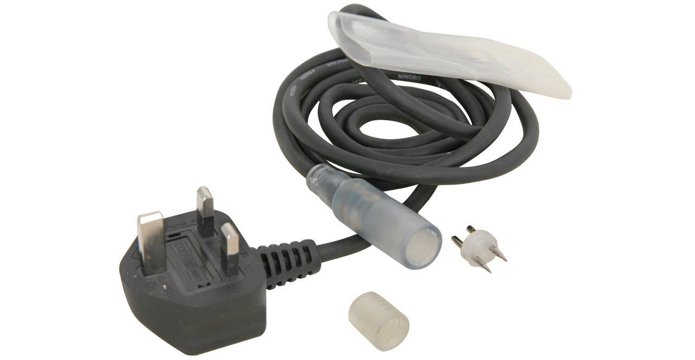 1.5m power cable with mains plug at one end and 2-pin connector at the other. Suitable for 230Vac rice bulb rope light. Box Contains 1 x Rope light power cable, plastic sleeve and end cap