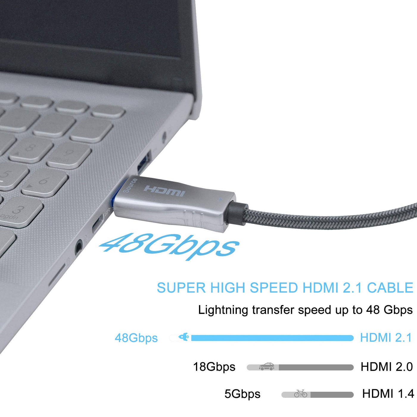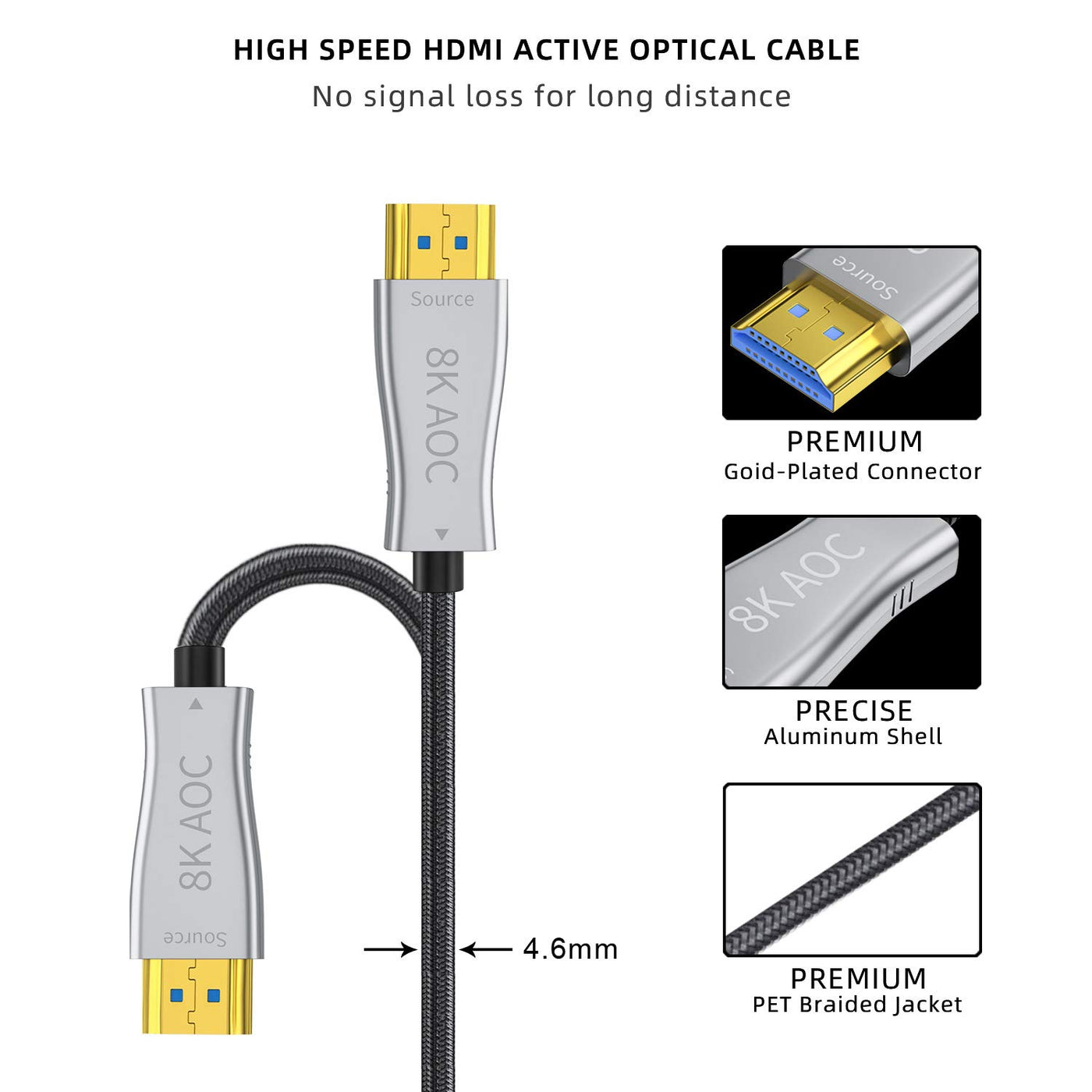 About Aieloar Fiber Optic 8K HDMI 2.1 Cable Features: --8K HDMI 2.1,with 8K@60Hz 76804320 resolution,HDCP2.2, 4:4:4,support 8K@60Hz/4K@120Hz/2K@144Hz,support dynamic HDR,VRR,QMS,ALLM. --48 Gbps bandwidth,support CEC and fast frame transfer,achieves long distance transmission over 300fts without delay and loss. --single way transmission,just plug and play,easy for bury or in-wall installation,doesn`t need any external power supply. --equipped with a nylon braided layer over the jacket for the cable body,effectively prevent the mouse or other potential damages. Notice: unlike the normal cooper HDMI cable, the optic fiber 8K hdmi 2.1 cable only support single direction transmission.SOURCE port for connecting HDMI signal source like Blu-ray,TV box,PS5 console,computer,laptop,etc. DISPLAY port for connecting HDMI display device like 8K TV, cinema projector, monitors,etc. please keep an eye on the SOURCE&DISPLAY port and install the cable in a right way. Ultral High Speed reach up to 48 Gbps bandwidth,support CEC and fast frame transfer,with strong anti-interference ability and high speed optical fiber transmission.support long distance transmission over 100 meters without latency and signal loss . Durability equipped with gold plated zinc alloy connectors, without impact for its performance after 10000 times insertion test.wrapped with durable nylon braid layer for the jacket prevent the cable from mouse bite or other damages. Build Your Home Theater connect the TV BOX or players with TV to build your exclusive home theater,provides a shock audio-visual enjoyment. with 4.8mm diameter thin and soft cord body, convenient for bury or in-wall installation. Read more Enhancing Game Performance compatible with PS5/PS4/Switch/Xbox and other consoles that support 8K HDMI 2.1 version or 4K HDMI 2.0 version,provides fatser and more powerful transmission,without delay or image stuck during games,enhanced the game performance and improve your record. Excellent Audio Effect support Ethernet and Audio Return Channel (eARC) enhanced the HIFI sound effect,with 32 audio channel and dolby vision.support multiple audio format transmission.Fully compatible with 5.1/7.1 sound channel.Plug and Play, no external power supply or signal amplifier required. High Resolution resolutions up to 8K@60Hz 76804320 ,quadruple definition over the 4K HDMI 2.0 version.backward compatible with 4k 2.0~2.0b/2K 1.4~1.4b/1.3/1.2/1.1.support dynamic HDR display and 3D stereoscopic imaging technique,improved the definition and quality for images and videos. Support audio and video sync transmission. Read more