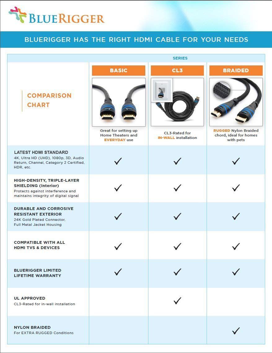 HEIGHTENED VIEWING EXPERIENCE 4K @ 60Hz Ultra HD - 4 times the clarity of 1080p video resolution BlueRigger HDMI cables are certified to have a bandwidth of 18 Gigabits per second which is sufficient for 4K resolution at 60 fps (frames per second) Screens with HDR increase brightness and display more colors than screens without. With HDR, colors are rich and vibrant, and the range of colors shown on the screen is closer to the range the human eye can see. The difference is very noticeable and very pleasing Read more DUAL VIEWING Synchronized Vdeo and Audio Streams Allows simultaneous delivery of Dual Video Streams and up to Four Audio Streams, all at the same time, to multiple users INCREASE IN BANDWIDTH Significant increase in bandwidth up to 18Gbps for enhanced consumer video and audio experience UP TO 32 AUDIO CHANNELS For a multi-dimensional immersive audio experience. Goes beyond traditional "surround sound" and delivers clearly perceptible, three dimensional, positional audio experience with up to 32 discrete channels. Read more BlueRigger High Speed HDMI cables connects a wide range of HDMI devices. Use it to extract the maximum performance from your gaming or home theater setup. Durably built for clear signals & minimal interference/physical strain, the BlueRigger Basic HDMI cable is triple-shielded with solid copper conductors & full metal jacket housing. Rugged Build - The HDMI cable is made of a PVC outer layer that protects from physical strain, external interference & maintains efficiency of the digital signal - Full metal jacket connector provides strength, durability and prevents interference as compared to other cables. - Built with 100% pure oxygen free solid copper strands that maximize signal strength and video quality - High Density Triple Layer Shielding maintains integrity and purity of digital sound - Gold plated, corrosion- resistant connectors deliver optional signal transfer with minimum distortion - These cables are ATC (Authorized Testing Center) certified to support all resolutions up to 2160p Quality Picture and Sound - Latest version HDMI cable supports 4K @ 60Hz, UHD, HDR, 3D content, Ethernet and Audio Return Channel - 4K, UHD, 2160p, 1440p, 1080p, 1080i, 720p, 480p, and 480i Resolutions - Supports Refresh Rates of up to 240hz and 48-Bit Deep Color - Supports Transfer Rates of Up to 600Mhz or 18 gbps - Works with all HDTVs, Blu-ray players, Xbox 360, PS3 and other HDMI devices - Supports True HD Dolby 7.1 and DTS-HD Master Audio - HDCP 2.2 Compliant Backwards Compatible with Previous HDMI Standards The cable is backwards compatible with all previous HDMI standards, so you'll be able to use the BlueRigger cable with all your HDMI devices.