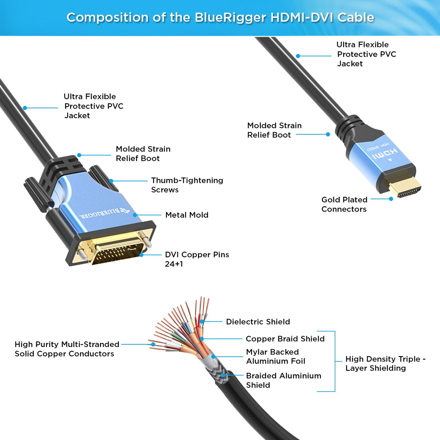EXTEND YOUR PC Laptop and External Display can show different screens with Extend mode for easy Multi-tasking Excellent Video Resolution - up to 1920 1200 Supports Full HD 1080p videos MIRROR YOUR PC Duplicate your screen for sharing information Mirror mode is ideal for making presentations Perfect for Conferences, Education, Gaming, Home Theater setup etc. EASILY ADD AN EXTERNAL DISPLAY Conveniently extend your desktop/workstation Connect your HDMI-equipped device such as a Playstation, X-box, Laptop to a DVI-equipped monitor Read more FLAWLESS SOUND TRANSMISSION Most of the Newer Generation Graphic Cards such as Nvidia 8000-series, ATI/AMD HD5000-series, Radeon 2000 (or newer) are able to transmit sound via the HDMI- DVI Cable through Sound Chips in them. NOTE: PLEASE ensure that the latest graphic cards & newest audio drivers are installed. Read more The BlueRigger HDMI to DVI Adapter Cable will connect any DVI-equipped monitor or TV set to any HDMI-equipped device such as Blu-Ray, PlayStation 3 or Xbox 360. These cables help you extract maximum performance from your gaming or home theater set up. USE WITH BLU-RAY PLAYERS, GAMING CONSOLES This BlueRigger HDMI to DVI Adapter Cable connects computers & other source devices with HDMI outputs such as Blu-Ray players, Xbox 360 to DVI-equipped televisions or monitors. It provides maximum support for resolutions up to 1920 x 1200. This cable supports high-bandwidth, uncompressed video & provides your system with high- definition video quality. COMPATIBILITY 1. Connect your DVI-equipped device to an HDMI-equipped HDTV or other digital display 2. Connect your HDMI-enabled devices such as computer, Blu-Ray, PlayStation 3, Xbox 360 to a DVI-equipped monitor or TV CONVERT YOUR COMPUTER INTO A HOME-ENTERTAINMENT CENTER With this cable you can watch computer based media on your TV or a projector. It connects computers with DVI connections such as home-theater PCs, Mac minis, & some laptops-to a HDMI-equipped HDTV or other display device with HDMI connection. FLAWLESS SOUND TRANSMISSION > Most of the Newer Generation Graphic Cards are able to transmit sound via HDMI-DVI cable through Sound Chips in the Graphics Card. > Graphic Cards such as Nvidia 8000-series (or newer), ATI/AMD HD5000-series (or newer), Radeon 2000 are compatible with the BlueRigger HDMI- DVI Cable. NOTE: For Sound Transmission through the BlueRigger HDMI to DVI cable PLEASE ensure that the latest graphic cards & newest audio drivers are installed. GOLD-PLATED CONNECTORS FOR OPTIMAL CLARITY The cable has a robust PVC outer layer, gold-plated HDMI A Male to DVI Male connector that offer protection from RF & EM interference. These connectors also resist corrosion while providing optimal signal transfers. All BlueRigger cables & adapters are backed for the Lifetime. Please approach us as needed.