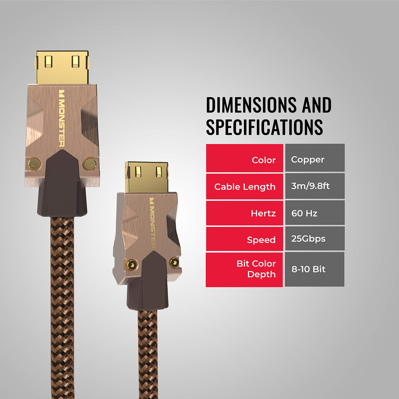 Length:3 m (9.8 ft), 25 Gbps Revolutionize the way you experience films, shows, and games with the Monster M-Series Certified Premium HDMI 2.0. This Monster HDMI 2.0 cable delivers 4K ultra high definition resolutions at a whopping 60Hz refresh rates and 8-10 Bit color ratio for that immersive picture and audio quality. Made with Monster's advanced cable technologies, this HDMI cable is designed with a Duraflex protective jacket with Triple Layer Shielding and corrosion-resistant 24K Gold Contacts to reduce wearing and tarnish as well as aid in delivering maximum signal transference. From our original speaker cable to this sophisticated UltraHD HDMI cable, Monster thrives on creating an experience that is as close to the real thing as possible.