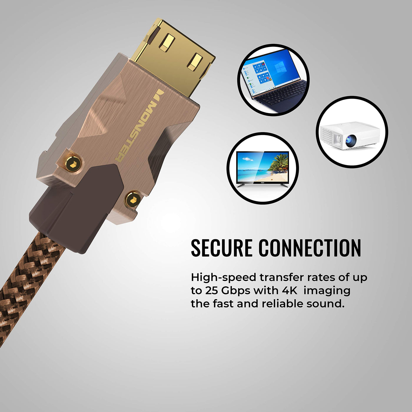 - PLUG AND PLAY AT HIGH RESOLUTION AND SPEED: Transforn the way you experience your films, TV shows, and games with the Monster HDMI 2.0 cable; This supports 4K Ultra High Definition resolutions at 60Hz refresh rate without the stubborn audio-visual stuttering