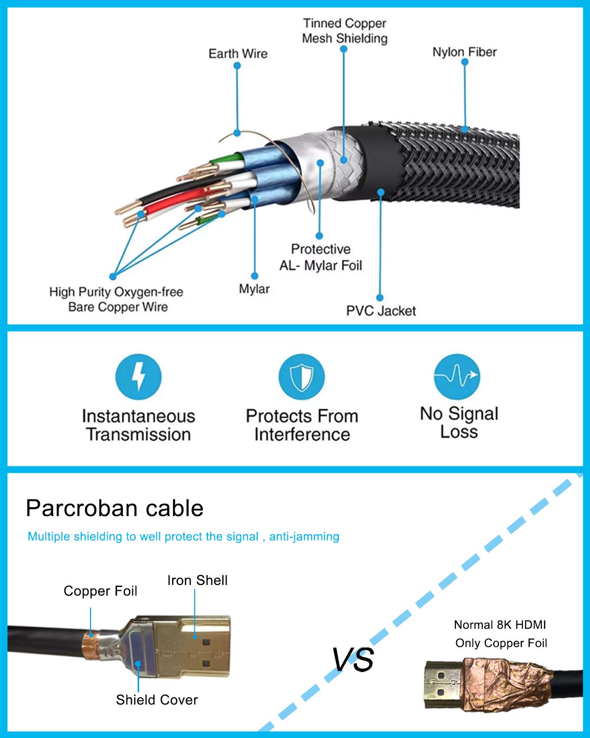 Pacroban White HDMI 2.1 Cable is the most recent update of the HDMI specification and supports a range of higher video resolutions and refresh rates including 8K 120Hz and 4K 144Hz, and resolutions up to 10K. Dynamic HDR formats are also supported, and bandwidth capability is increased up to 48Gbps. Supporting the 48Gbps bandwidth is the highest speed of any HDMI Cable. This White HyperFast ensures high-bandwidth dependent features are delivered including uncompressed 8K video with HDR. It features exceptionally low EMI (electro-magnetic interference) which reduces interference with nearby wireless devices. The cable is backwards compatible and can be used with the existing installed base of HDMI devices. Why Pacroban HyperFast is Game Changer? The 2.1 update adds a “Game Mode VRR” feature, which allows a source device, like a PC or game console, to synchronize its refresh rate with a connected display. This will ideally reduce screen tearing dramatically. Another great feature created with gamers in mind, Auto Low Latency Mode (ALLM), also known as Auto Game Mode, allows supported TVs to automatically enable the TV's low latency 'Game' mode when it detects a game being played. This saves you the hassle of having to manually enable it each time you start playing. It even knows the difference between playing a game, watching a game on YouTube, or watching a movie, and automatically switches as needed. Audio will get a boost too. Enhanced Audio Return Channel will enable object-based audio schemes similar to Dolby Atmos and DTS X. This makes positional audio more realistic, regardless of how many speakers your surround sound setup has. Enhanced refresh rate features ensure an added level of smooth and seamless motion and transitions for gaming, movies and video. They include: Variable Refresh Rate (VRR) reduces or eliminates lag, stutter and frame tearing for more fluid and better detailed gameplay.Quick Media Switching (QMS) for movies and video eliminates the delay that can result in blank screens before content is displayed.Quick Frame Transport (QFT) reduces latency for smoother no-lag gaming, and real-time interactive virtual reality. Version 2.1 of the HDMI Specification is backward compatible with earlier versions of the Specification and is available to all HDMI 2.0 Adapters. Contact Pacroban Directly Read more Why it is a great investment? What HDMI 2.1 really means to you? HDMI 2.1 increases the maximum uncompressed bandwidth that an HDMI cable can handle up to 48Gbps. It will be quite some time before devices actually need that much bandwidth, and TV manufacturers have the freedom to support only the bandwidth that they need. For example, your TV supports 4K @ 120Hz, with 4:2:0 chroma subsampling, then it only need to support 32.08Gbps, and can still be considered an HDMI 2.1 device, so you need this cable. When you upgrade your devices to 8K, you don't need to buy a new HDMI Cable. At the same time, it works with all previous HDMI devices. This cable will easily handle all your HDMI needs. SlimWhite HDMI 4K Braided HDMI 8K Female to Male HDMI 2.1 Detachable Heading HDMI Cable USB-C to HDMI Cable 4K at 60Hz ✓ ✓ ✓ ✓ ✓ Material Chopper Chopper Fiber Optic Fiber Optic Fiber Optic Length 1.5 - 17ft 1 - 15ft 25 - 330ft 25 - 330ft 15 - 200ft Male-to-Male ✓ ✓ ✓ ✓ HDMI 2.1 ✓ ✓ Read more