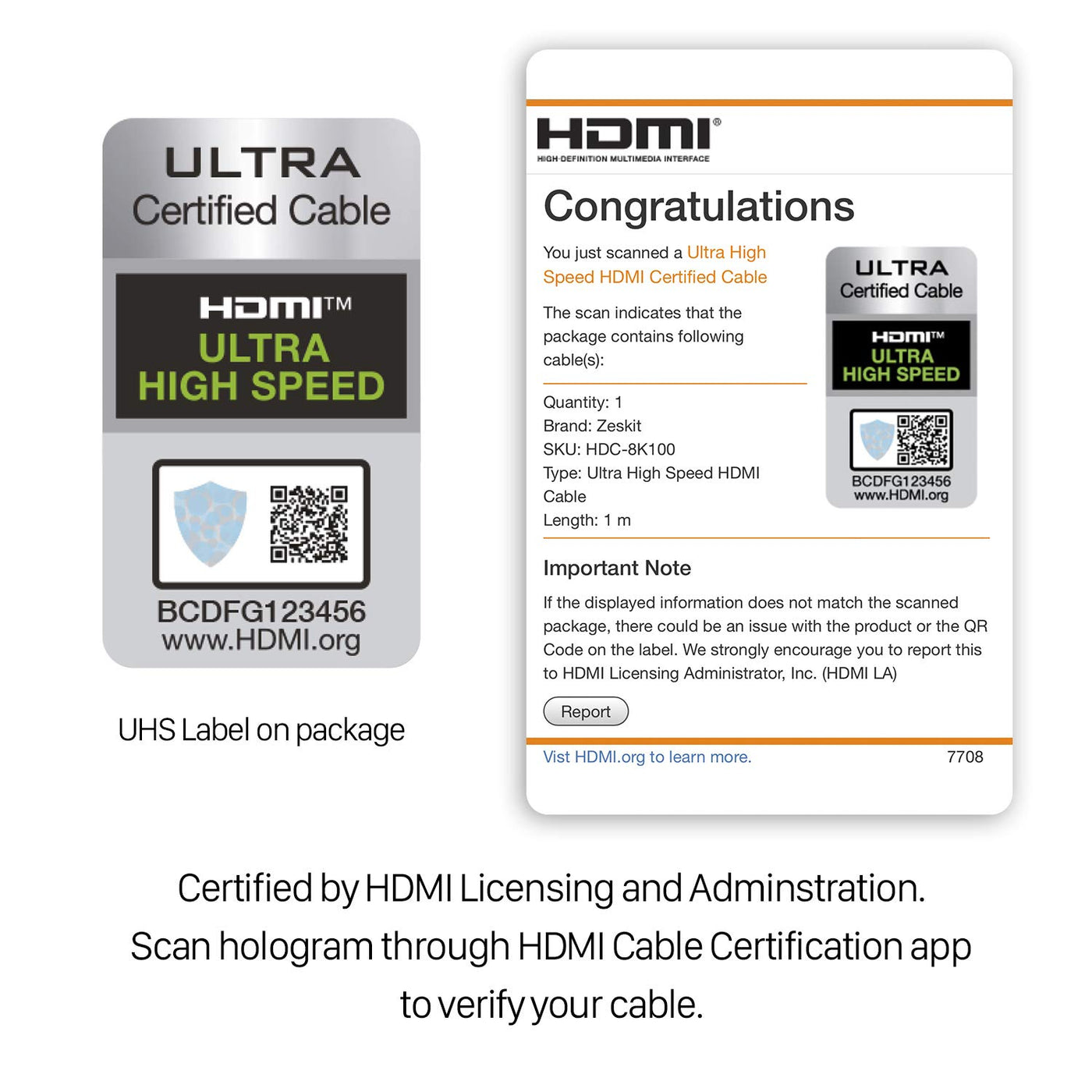• Ultra High Speed HDMI Cable Certified (w/ Hologram Sticker)