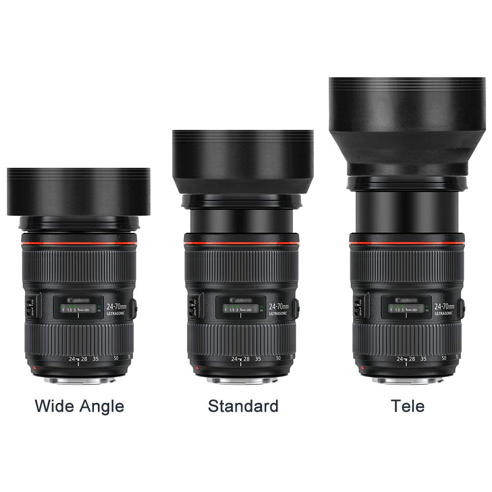 - [Material] : This collapsible lens hood is constructed of Rubber,lightweight and durable,Since it can be collapsed, it have two advantages(Satisfying your need : It can be stretched to 3 different lengths,you can stretch it to the most suitable length according to the focal length of your lens.Save more Space : Easy to carry to travel.