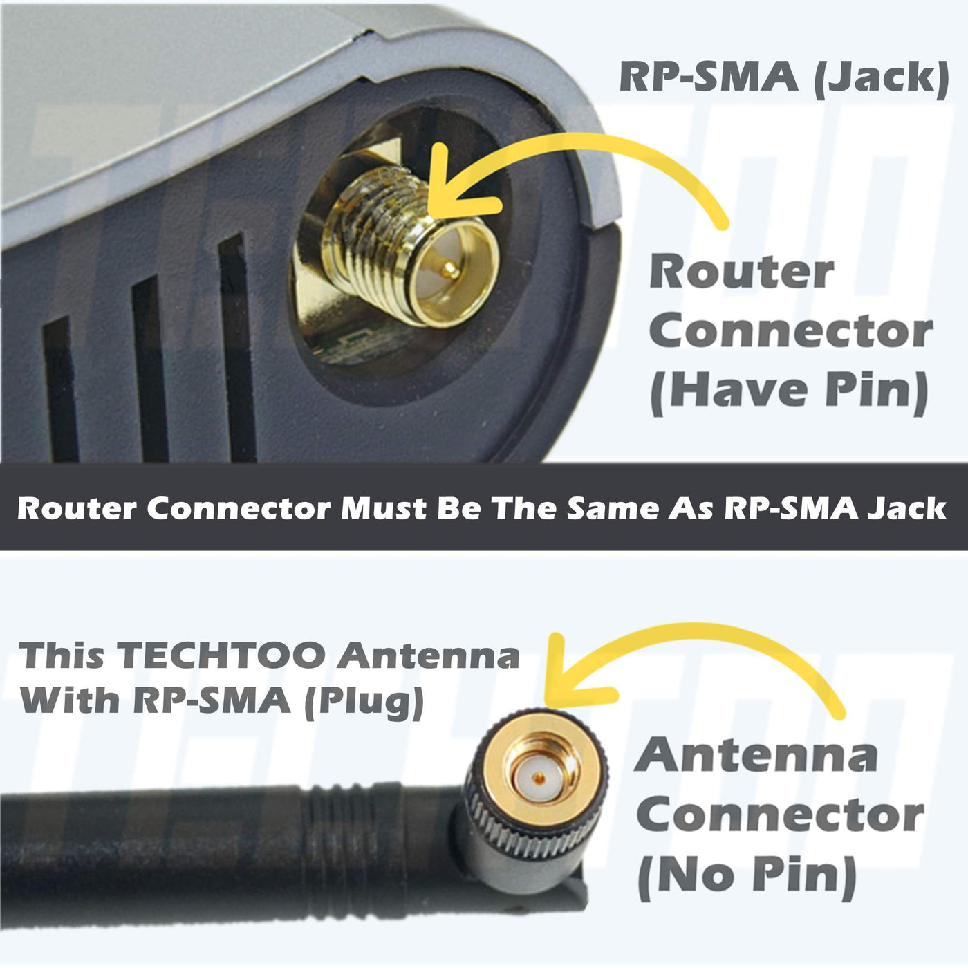 TECHTOO is one of the most desired brand in North America, Europe and Asia. Note: This antenna with RP-SMA Plug connector (Thread inside WITHOUT Pin). It only match RP-SMA Jack connector (Thread outside WITH Pin) DO NOT Support FOSCAM IP Camera (Connector type: Thread outside WITHOUT Pin) Change ALL the Antennas into NEW TECHTOO 9dBi Antennas, If your old Device Have More Than One Antennas. TECHTOO 9 dBi 2.4GHz Omni Antenna with RP-SMA Connector Can Increase The Range of Your Wireless Router/Access Point or Client. Off the shelf equipment typically has a 2.0 dBi antenna. This antenna will increase your signal strength and therefore range. The Rugged Polycarbonate Body Makes Them Suitable For Use In a Wide Variety Of Applications, Including Office LAN Environments Factory Floors, Remote Telemetry And Other Environments. The RP- SMA Connector Has Threads on The Inside And a Center Socket. The Tilt And Swivel Feature Allows The Antenna To Be Positioned At Practically Any Angle. This Screw-on, Swivel Mount RP-SMA FEMALE Connector Is Compatible With Many Wireless Communications Systems Including: Dlink, GRE America, Linksys WET11, Maxtech, Netgear, Proxim, Siemens, SmartBridges, Waveaccess, Zcom, Netgate Wireless-Redy M1n1wall, RouterStation PRO Products And All USB Adapters With Screw on/off Antennas ,Such As The ALFA And EnGenius USB products.