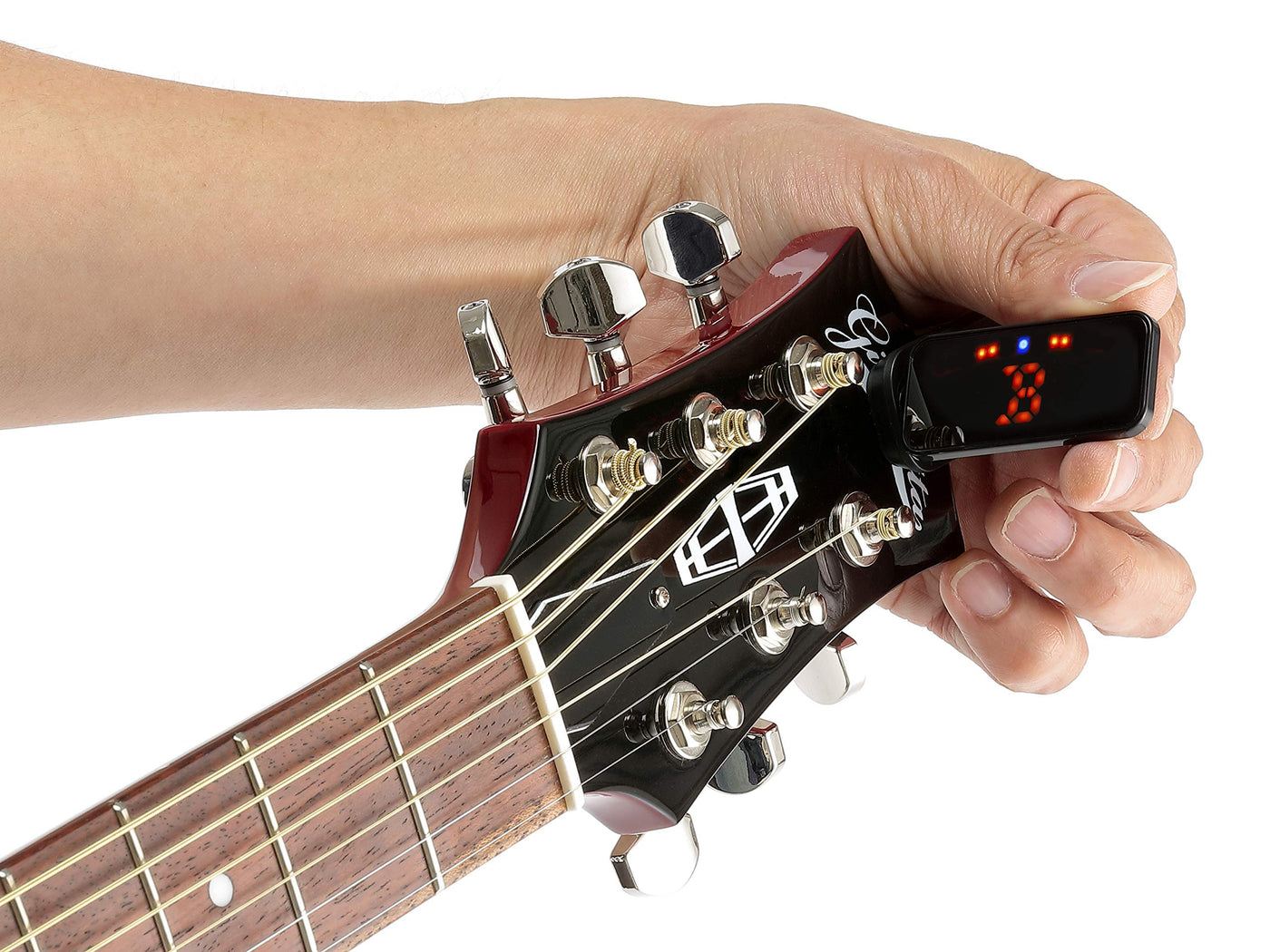 Even a great performance won't be worth much if the tuning is wrong. KORG Pitchclip 2+ uses approximately 2.5 times as many meter LEDs, allowing even more precise pitch adjustment. Basic functionality such as the calibration function and 0.1 cent high-precision tuning have also been dramatically improved. Additionally, the display now rotates vertically, allowing for easier viewing. A significantly updated display section, LED meter boasts detailed display resolution The LED meter section now has a significantly increased the number of LEDs, from seven on our previous model (Pitchclip 2) to 17, allowing pitch inaccuracies to be shown in even greater detail. Furthermore, when two adjacent LEDs are lit, their brightness varies to indicate higher or lower pitch. All note names shown in uppercase characters and a specially designed 12+1 (=) segment LED is newly used in order to clearly show a guitar's 4th string (D) and 2nd string (B) in uppercase characters. Even when attached to the back of a guitar's headstock, the unit can be inverted vertically to display uppercase characters. Position at the best angle for players, A bent clip can look unsightly when the tuner is attached to the headstock, but the KORG Pitchclip 2+ lets you leave the clip in the same position while you freely adjust only the screen to the best angle for comfortable viewing. A full complement of functions for tuning, 0.1 cent high-precision tuning. This KORG tuner supports ultra-high-precision tuning as accurate as 0.1 cents ( when using Strobe mode or Half Strobe mode). By precisely adjusting your pitch, you can feel confident in your tuning and play great-sounding harmonies. Calibration function, the calibration function lets you adjust the reference pitch in order to support tuning with a variety of instruments. This gives you the precision and flexibility that you need when performing in an ensemble with other instruments such as an orchestra or a piano. Reverse display that's convenient for left-handed players as well, The reverse function lets you vertically invert the meter display so that the characters are shown correctly even when the tuner is attached to the back of the headstock. This is a convenient feature that will be appreciated by left- handed players or by those who attach the KORG tuner to the back of the headstock so it will be less visible from the front. Strobe and Half Strobe modes, This KORG tuner is equipped with "Strobe" and "Half Strobe" modes that provide a beautifully flowing LED display. These modes let you resolve pitch discrepancies down to an ultra-precise accuracy of 0.1.