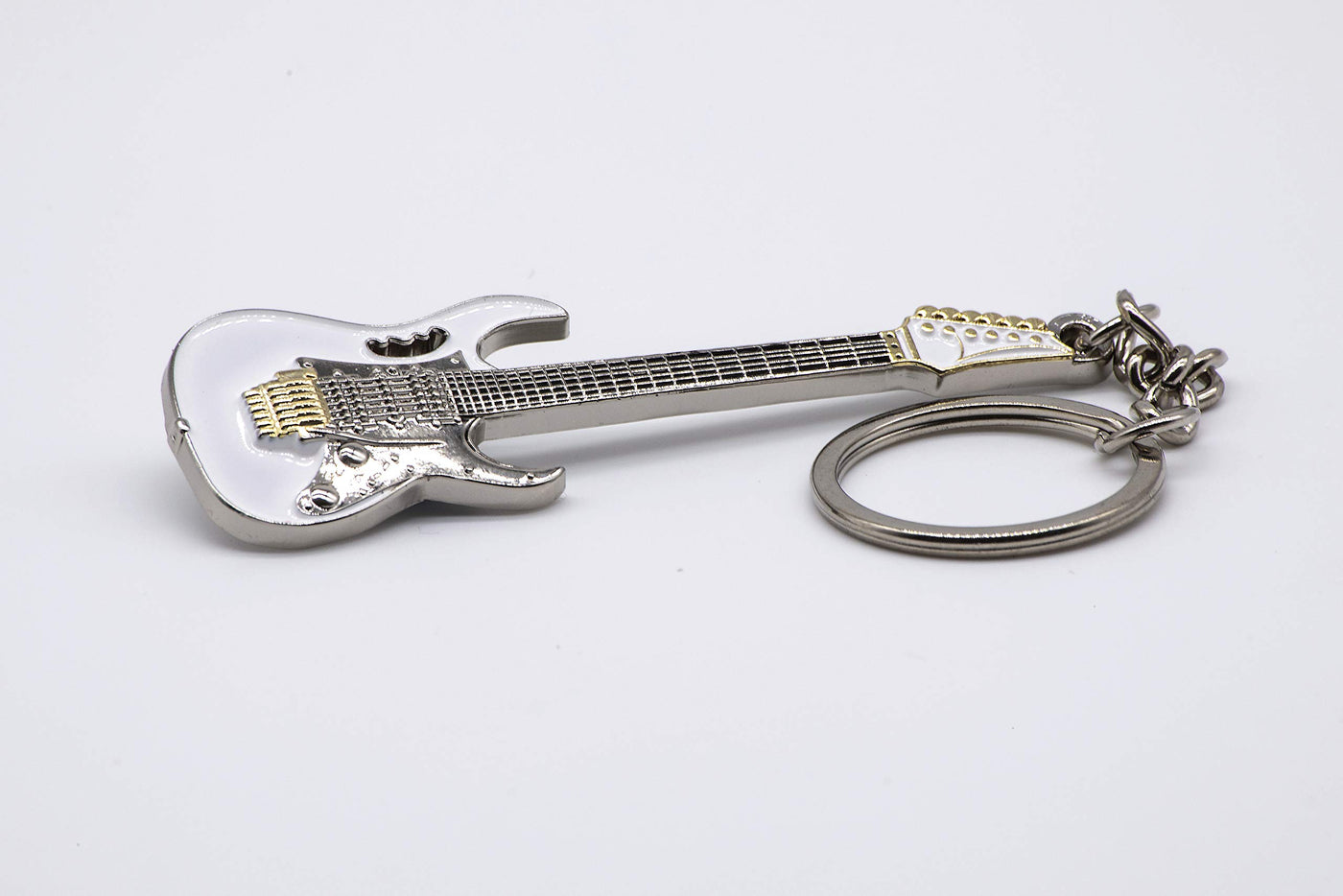 Solid metal guitar keyring measures 80mm long excluding chain. Fantastic detail and presented in a luxury gift pouch