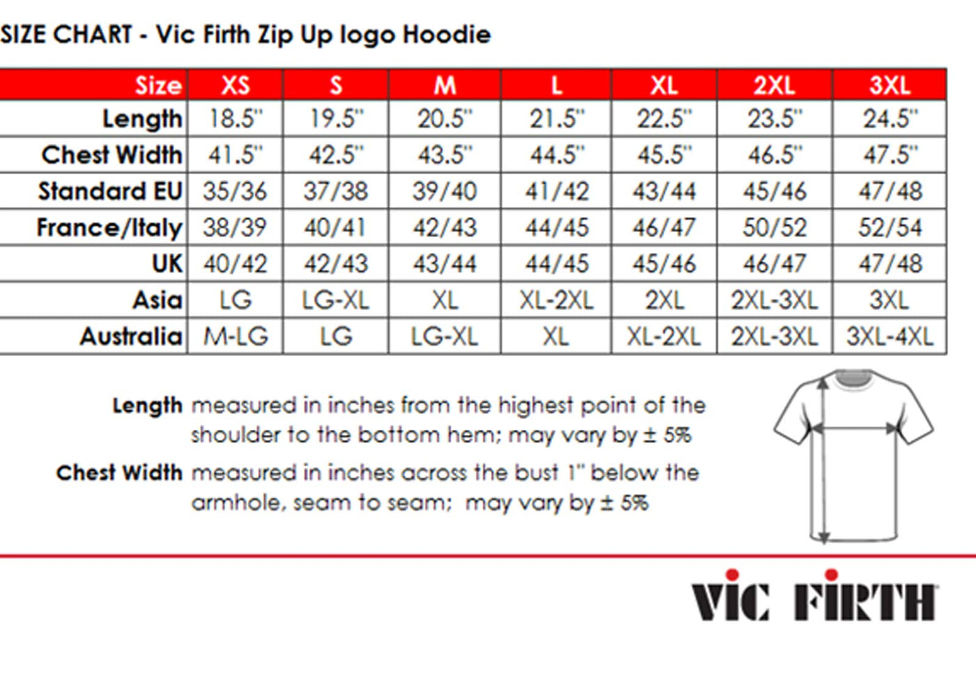 - The Hoodie has a vertical Vic Firth logo on the front right chest with the VF 'EST. 1963' seal graphic on the left chest