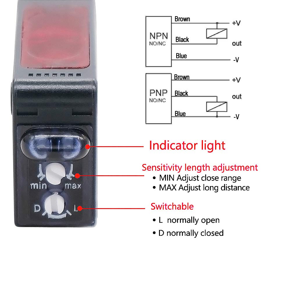 - Supply Voltage:10-30V DC;Type : NPN(Switchable normally open or normally closed);Wire Type : DC 3 Wire