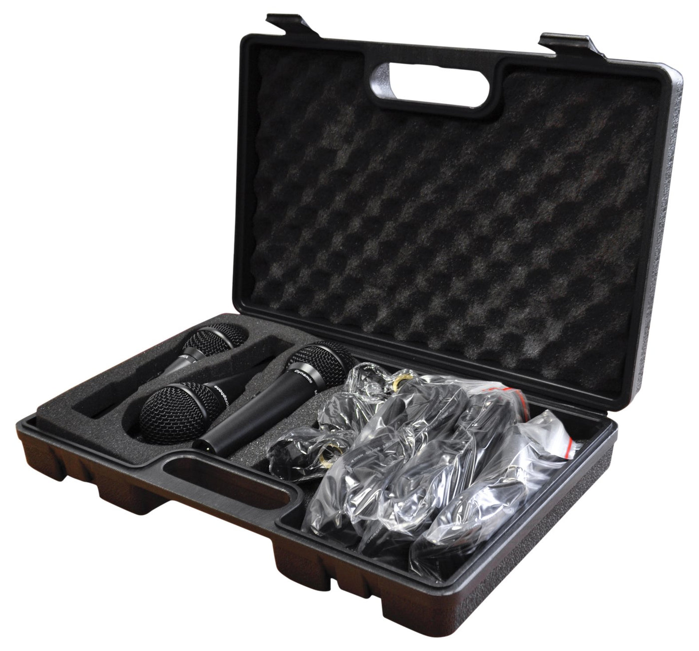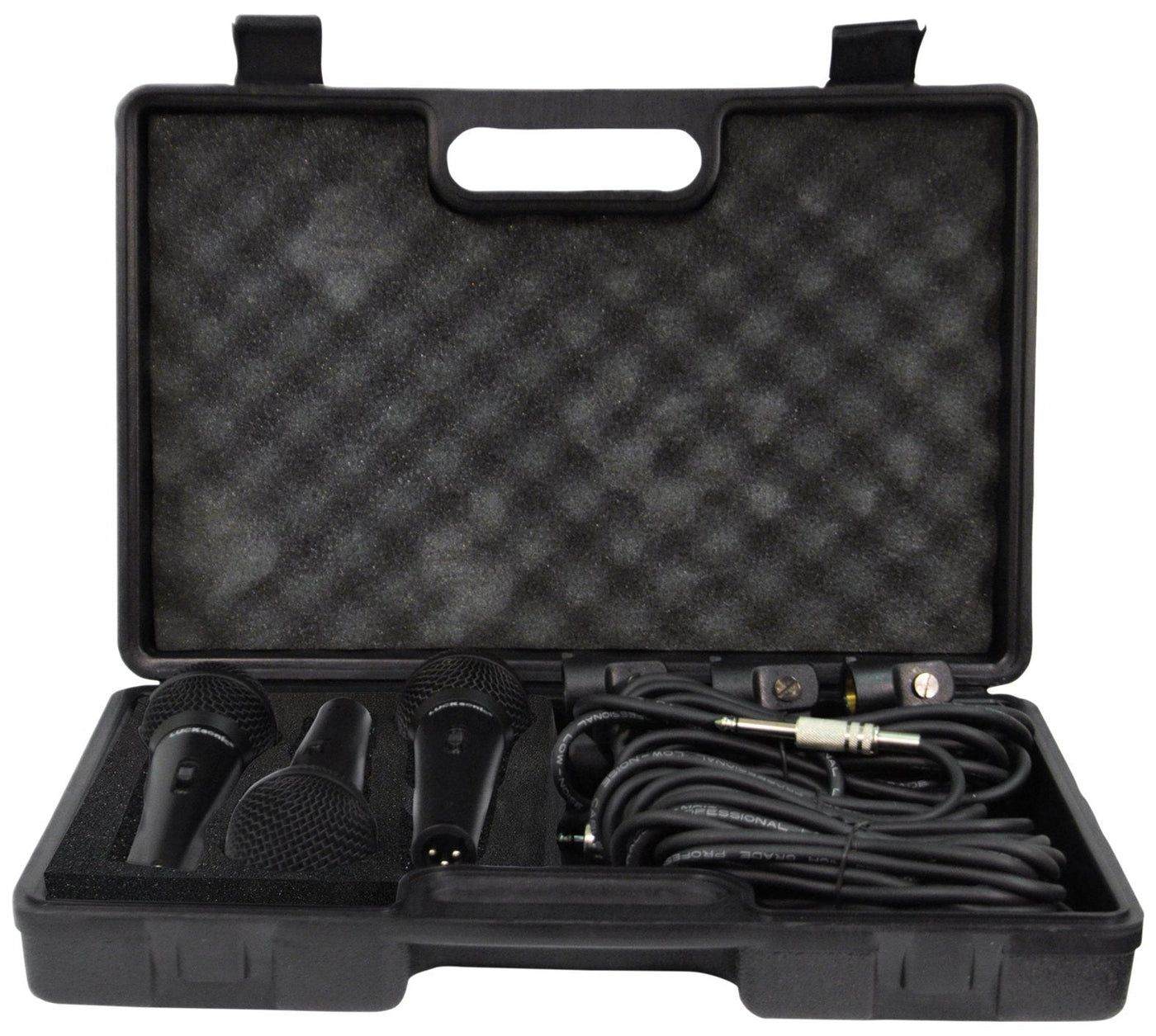 Premium microphone kit featuring 3 good quality metal switched dynamic microphones with holders and 4m XLR leads in a robust egg foam lined carry case .With an extended frequency range this product is ideal for male and female vocals or for instrumental applications and is equally suited for PA, stage or karaoke use.