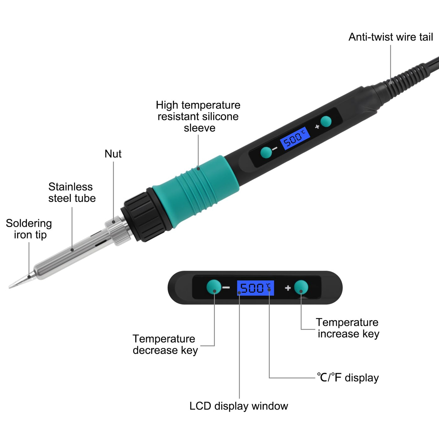 - [100W Soldering Iron] - Powerful 100W plug ceramic heating core for fast heating with adjustable temperature of 200-500C (392-932F). The clear LCD display and the 1 increase/decrease buttons allow precise temperature control _x000d_