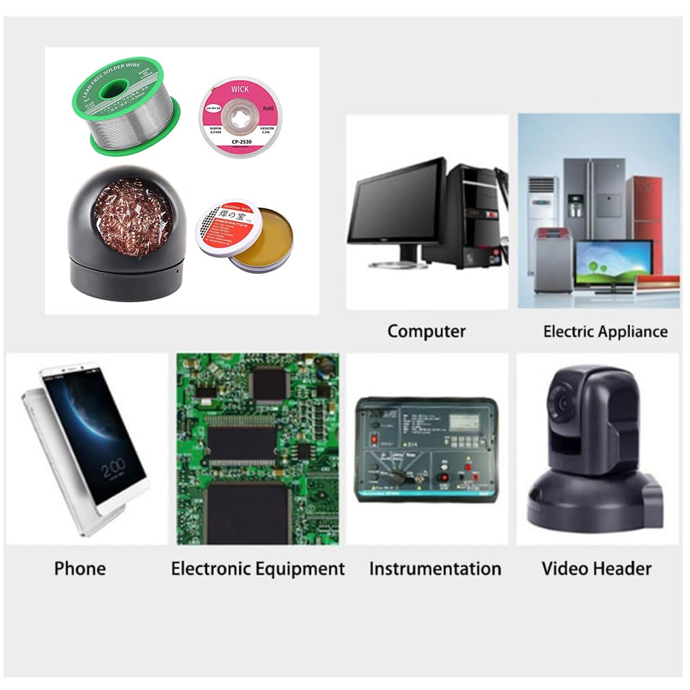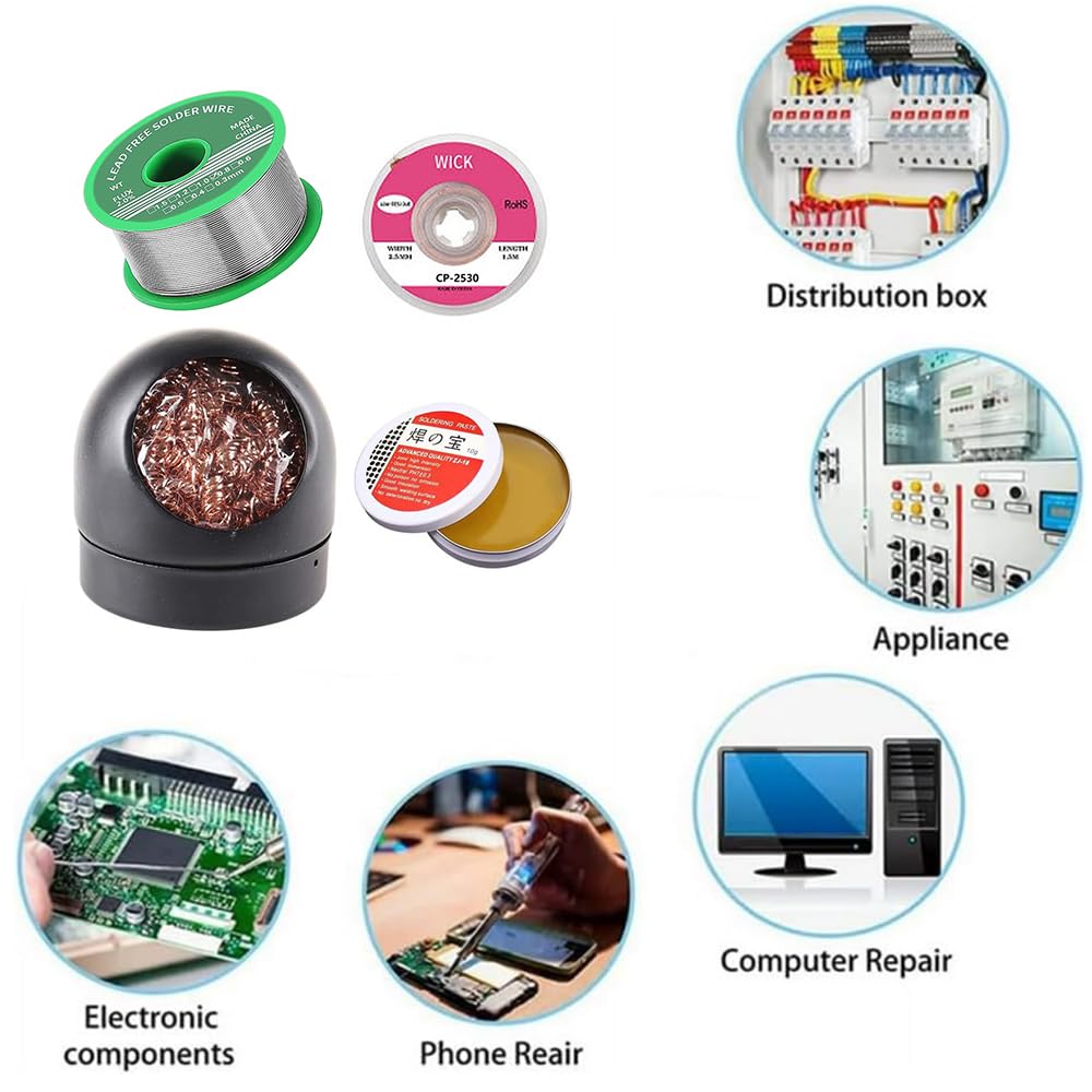 _x000d_Soldering tip cleaner: Includes base and brass wire balls that help remove_x000d_ excess solder to extend tip life and achieve clean, precise soldering. Brass_x000d_ wire cleans the tip without water and maintains peak temperature. Suitable for_x000d_ dry soldering irons. In addition to the base, brass filament refills can be_x000d_ purchased separately. Solder wire: Durable and environmentally friendly. Good_x000d_ fluidity and even heating. Diameter: 0.8 mm. Weight: approx. 20 g. Rosin: Less_x000d_ residue and no cleaning required. Stable performance, safe and reliable to_x000d_ use. The weight is 10 g. It is an ideal auxiliary product for producing high-_x000d_ quality electronic products. No-clean desoldering core: High purity copper_x000d_ wire High quality desoldering braid with good desoldering and soldering_x000d_ properties. Quickly removes unwanted solder when used with a soldering iron._x000d_ Suitable for desoldering circuit boards, computer motherboards, mobile phone_x000d_ boards, etc. Can be used for precision plates Length: 3 m. Width: 2.5 mm._x000d_ Package contents: 1 x soldering tip cleaner. 1 x tin solder wire. 1 x rosin_x000d_ solder paste flux. 1 x no-clean desoldering core.