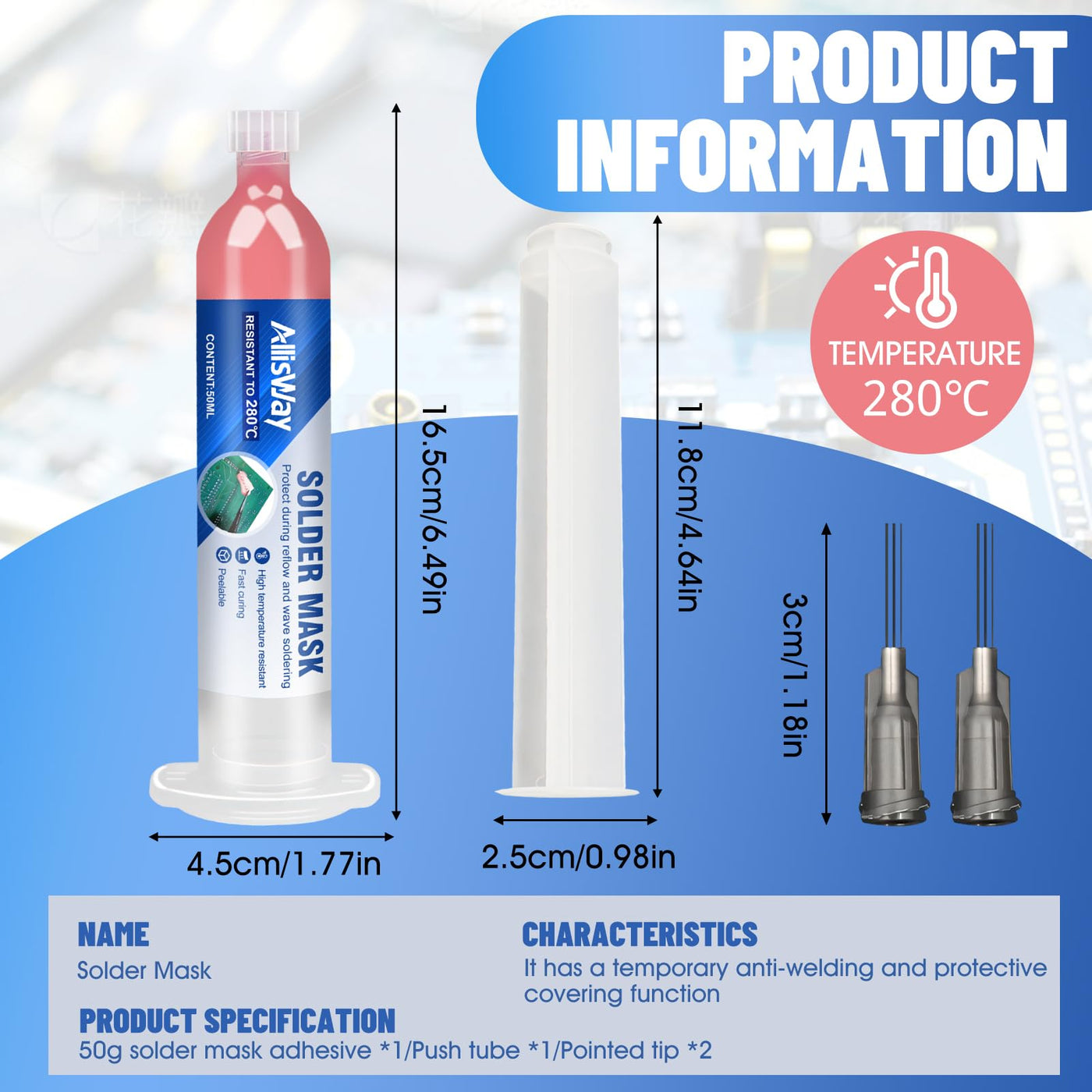 _x000d_Features: 1. Withstands high temperatures of 280 C 2. Good toughness, easy to_x000d_ peel off, no residue 3. No corrosion or oxidation of components 4. Can replace_x000d_ high temperature tape. Specifications: 1 x 50 g solder stop mask. 1 x push_x000d_ tube. 2 x sharp mouths. Steps: 1. Surface Cleaning: clean the surface of the_x000d_ object to be coated, remove rust, dust and oil stains, etc. 2. How to use:_x000d_ open the bottle cap, squeeze and apply by hand or apply to the product surface_x000d_ with a brush. 3. Curing: It can be dried at room temperature. After curing, it_x000d_ can be removed by gently tearing with your hand or tweezers without leaving_x000d_ adhesive residue. Note: 1. Avoid contact with open fire. 2. After use, please_x000d_ close well and store in a cool and dry place.