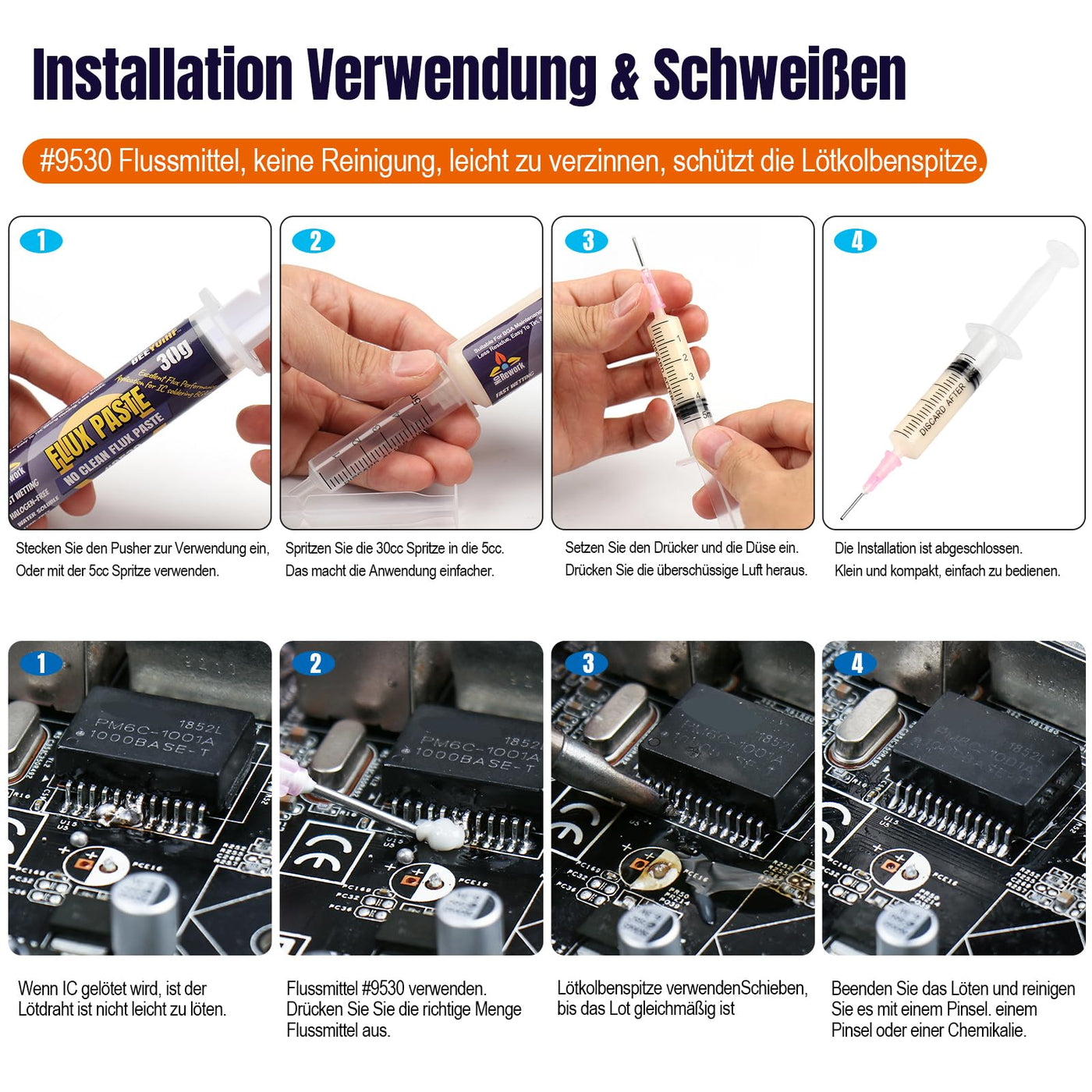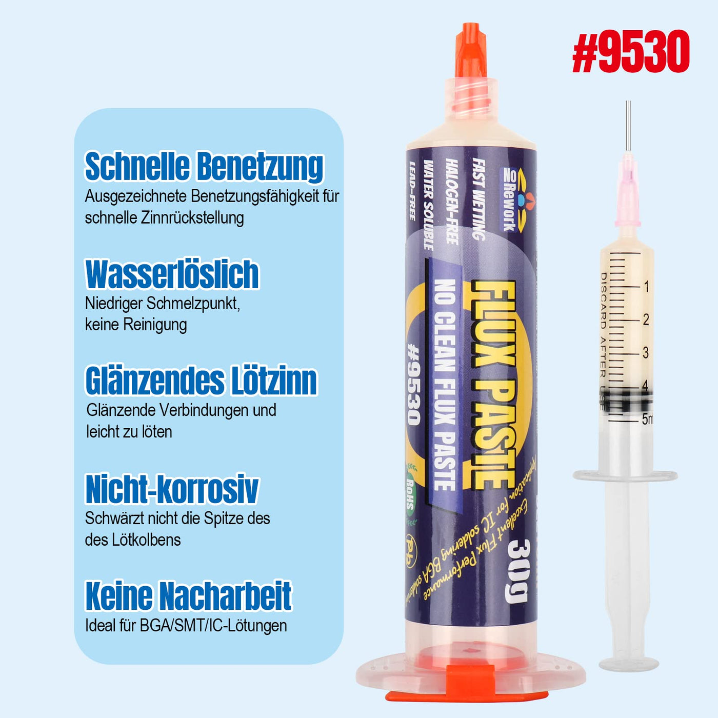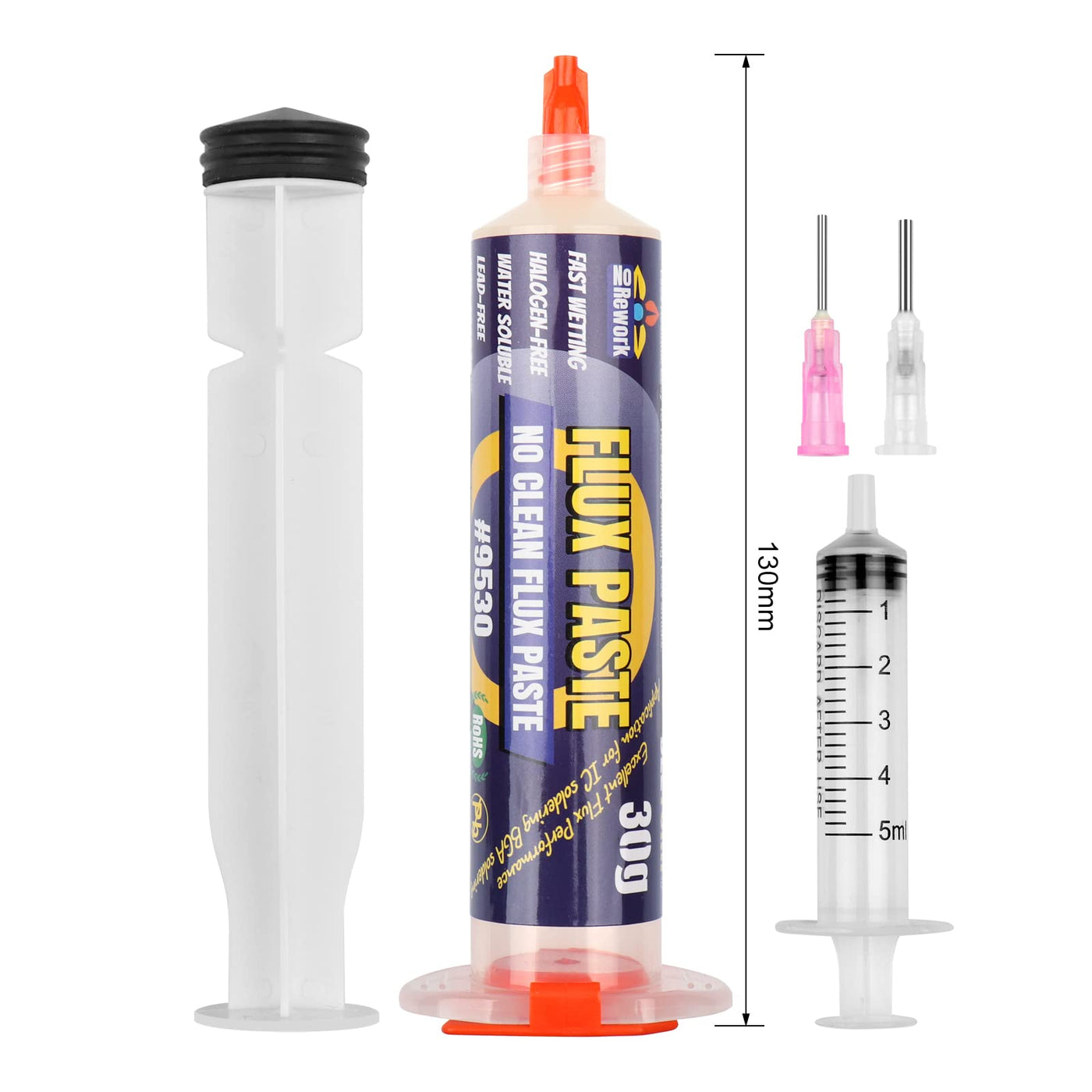 • Soldering paste flux weight: (1.62 oz/46 g) 30 ml syringe Rosin solder paste flux, made of no acid, lead-free, no clean, solder fluid paste that is not easy to dispose of. BGA flux paste, easy to tin, very little residue.