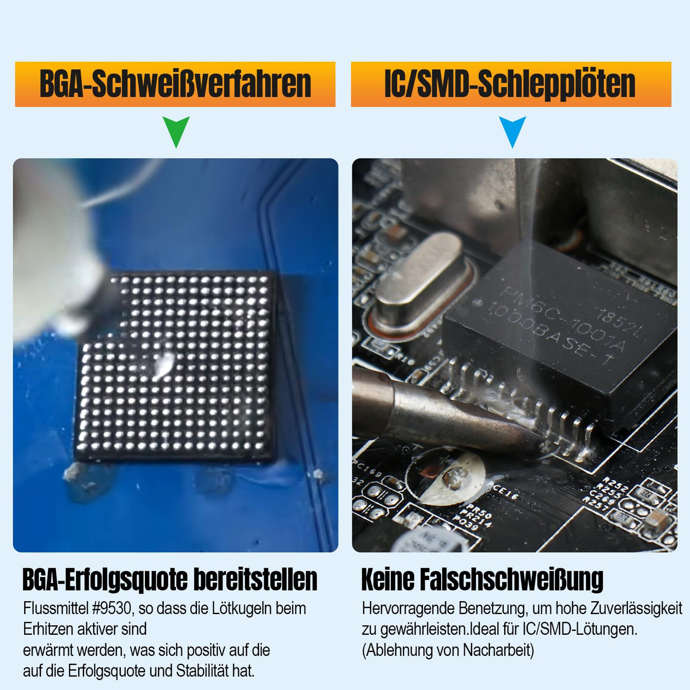 • Flux flux soldering area of application: suitable for soldering iron tip cleaning, mobile phone, BGA repair, PC card and other precision electronic chip level flow soldering. Have strong oxide removal effect on gold copper alloy substrate and wire.