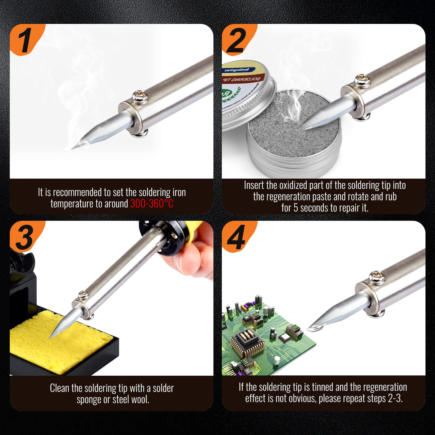 • Warm tips: It is recommended to set the temperature of the soldering iron to about 300-360C before use. If you have any questions about the product, please contact us and we will provide you with satisfactory service