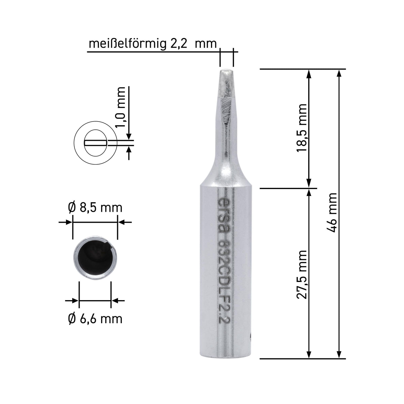 _x000d_Permanent soldering tip, straight, chisel-shaped, 2.2 mm wide, with Ersadur LF_x000d_ coating (lead-free soldering) for increased service life. Suitable for the_x000d_ soldering stations ANANLOG60, ANALOG60A, DIGITAL80, DIGITAL80A, DIGITAL2000A,_x000d_ RDS80, MICRO-CON60, TWIN80A, ELS8000/M/D, MS6000 as well as MS8000 and the_x000d_ soldering iron power tool, Ergo-Tool, multi-tool. Multi-TC, Multi-TCC, C 70_x000d_ and Multi-Sprint. Ersadur soldering tips are manufactured to a high quality_x000d_ and created for continuous operation. In a special process, they are_x000d_ galvanically plated with an iron layer and protected against corrosion and_x000d_ oxidation by an additional chrome layer. Perfect heat transfer protects the_x000d_ radiator of the soldering iron from overheating and premature wear.