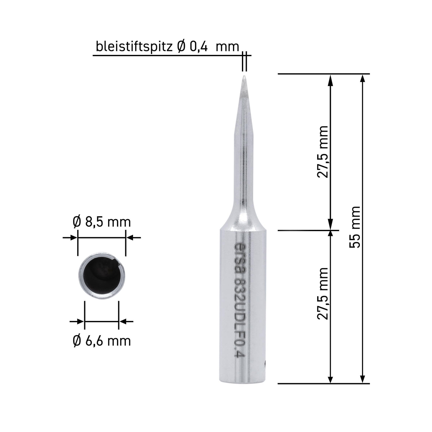 - Permanent soldering tip, straight extended pencil tip, 0.4 mm diameter with Ersadur LF coating (lead-free soldering) for increased service life 0832UDLF _x000d_