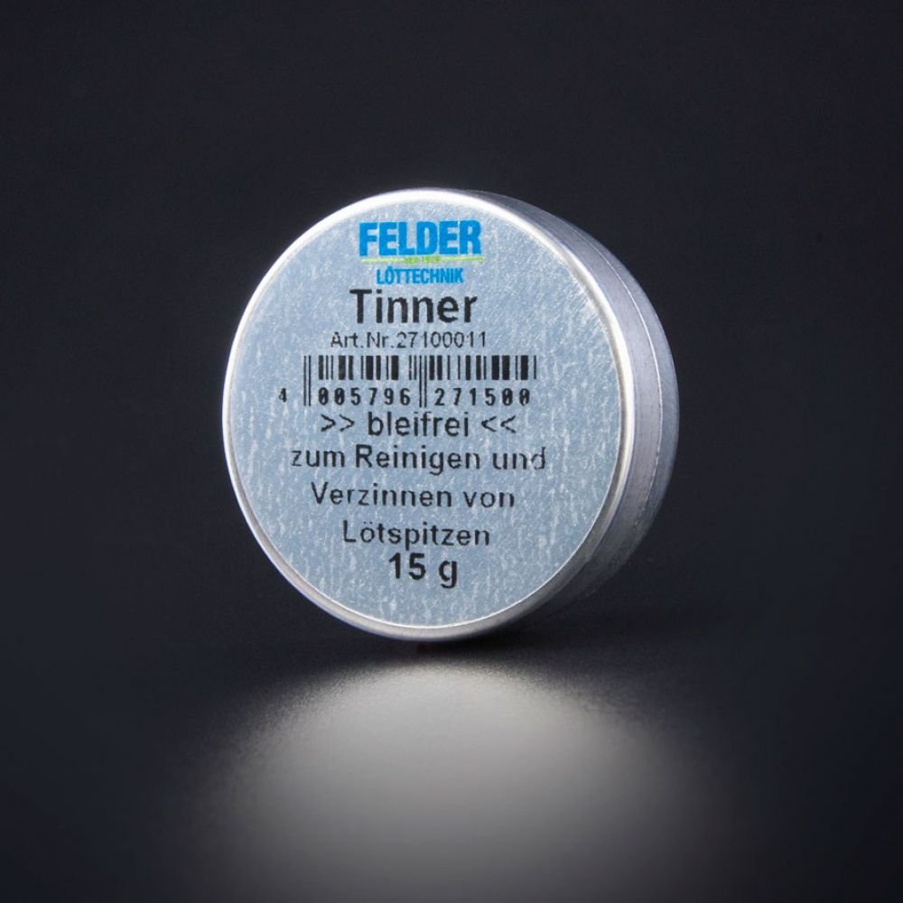 _x000d_'Tinner "bleifrei, DIN EN 61190, Type REL0 Item No: 27 10 00 11 Description_x000d_ 'The "Lead Free is made from a blend of Lötaktivatoren, Bindemitteln and_x000d_ fields Tinner lead free solder wire powder. 'The Fields Tinner lead free tin-_x000d_ plated, cleans and protects soldering iron spikes easily and without the_x000d_ hassle of fume (ammonium chloride free.). Features No harmful fumes –_x000d_ Salmiakfrei (.) – Lead Free – Increases the service life of the soldering tips_x000d_ – Long service life – practical in a resealable tin with adhesive pad on the_x000d_ bottom of the box on both sides – Easy to use Alloy: SN97CU3 Density (20_x000d_ °C): 2,77g/cm³ Melting Point: 230 – 250 °C Flux: REL0 Color: Silver Grey_x000d_ Use 'The Fields Tinner "Lead Free is most commonly used work breaks and from_x000d_ work from the end. The soldering tip should be a temperature of 250 °C up to_x000d_ approx. 400 °C, this means that the galvanised Innung process ideal can drain_x000d_ out. To achieve optimum results and 7 days depending on the hot soldering iron_x000d_ tip short in Tinner submersion until the glue at the tip Aufschmilzt they_x000d_ benetzt. Then mop up any belt Detachable stick-jelly activation residue with a_x000d_ metal sponge (Please do not use cleaning sponge wet.) Remove and turn off the_x000d_ soldering iron.