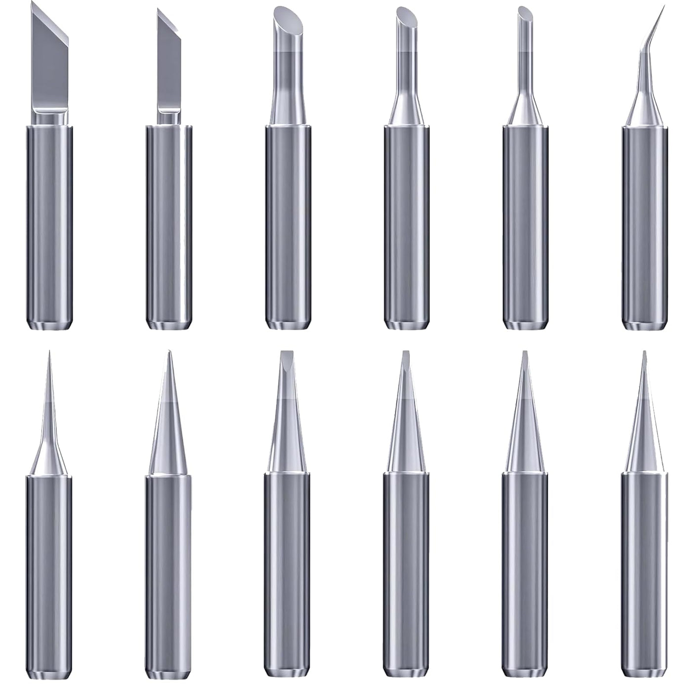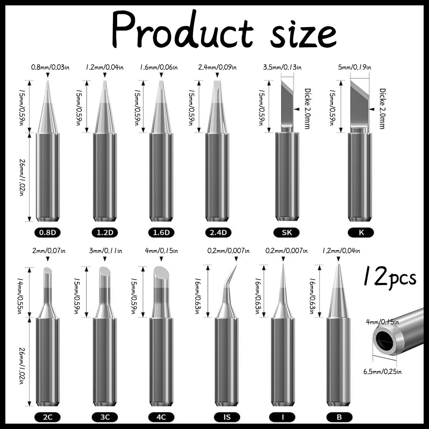 • The set includes: 12 different shapes of soldering tips, including cone (I B IS), knife (SK K), angle (2C, 3C, 4C) and chisels (0.8D, 1, 2D, 1, 6D, 2, 4D), which can be used for different welding tools and your needs.