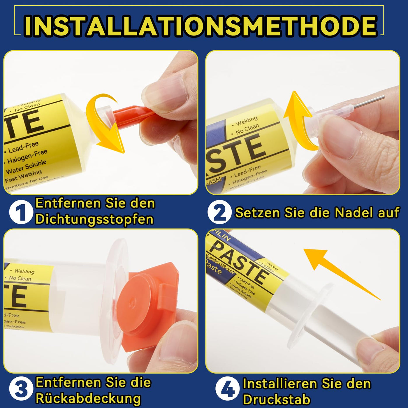 - High capacity and accessories: pack of 2 30 g flux soldering, total 60 g/2.12 oz. Contains 2 needles, 1 pusher and 1 syringe. Easy to use and no waste thanks to airtight packaging. Perfect for precise application of solder flux _x000d_