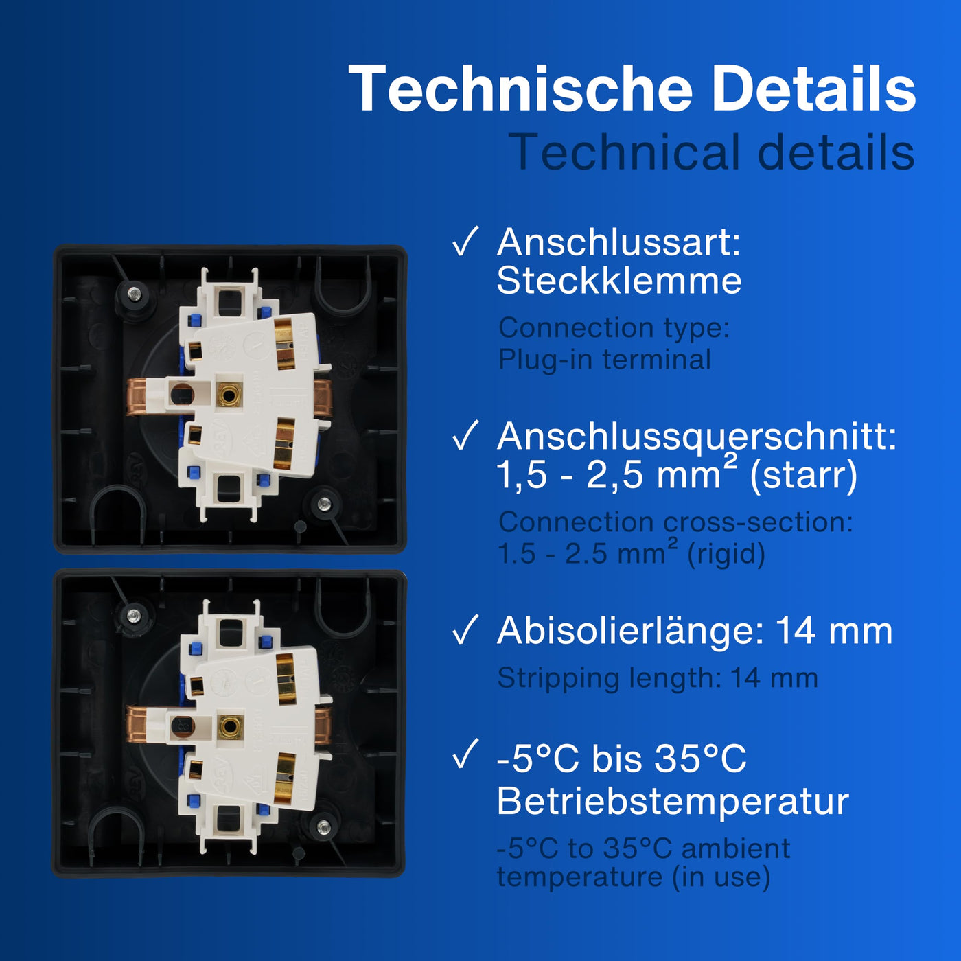 - Sockets: 230V~, 16A, 3680W, with plug-in connection. Connection cross section 1.5 - 2.5 mm2 (rigid). Box contents: 1 x double socket _x000d_