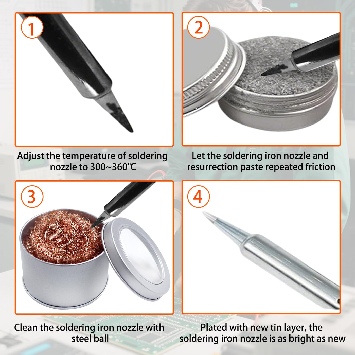 - Cleaning and restoration: our soldering tip cleaner quickly removes oxides from the surface of the soldering iron tip, without damaging the tip, thus extending the life of the tip. The soldering tip cleaner electrically tin-plated the soldering iron tip, improves your tinning ability and restores your shine for precise soldering. Our soldering tips re-activator also does not lower the temperature of the soldering iron tip and maintains heat transfer, so that the tip can continue to melt solder without affecting work efficiency _x000d_