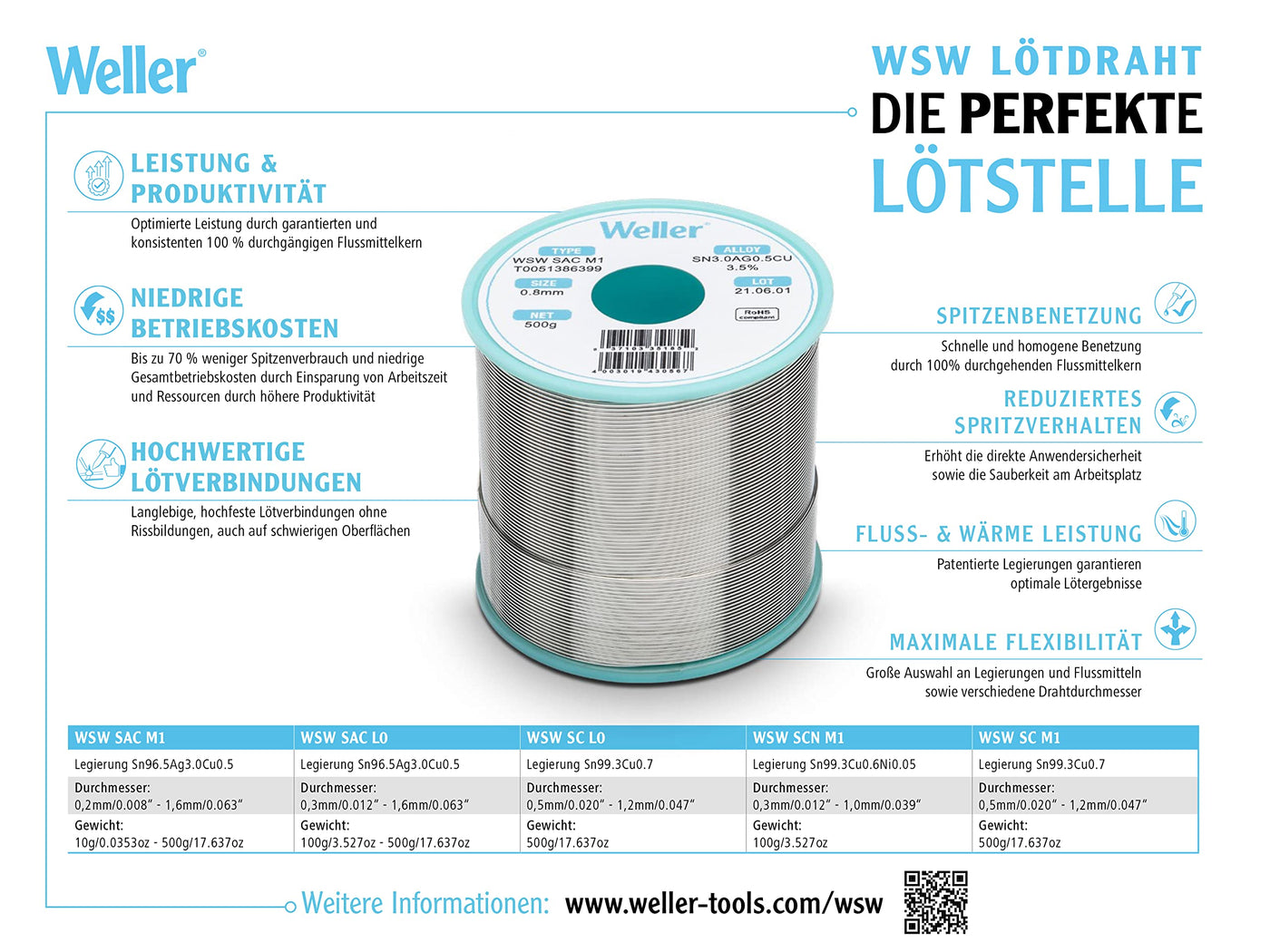 Weller WSW SCN M1 (T0051402799) 0.5mm Lead Free Solder Wire Alloy Sn99.3Cu0.6Ni0.05 Flux Content 3.5% 100g Silver 0,5mm, 100g