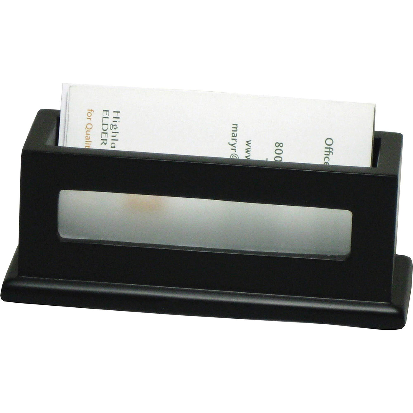 Business card holder is part of the Victor Midnight Black Collection that combines functional solutions with appealing design elements. Open design offers easy access and loading. Sturdy wood construction includes a crown molding base and durable, double-coated, matte black finish. Frosted glass window adds a touch of class. Nonslip rubber feet reduce movement and protect your worksurface from scratches and scuffs. Business card holder displays and holds up to 60 business cards.