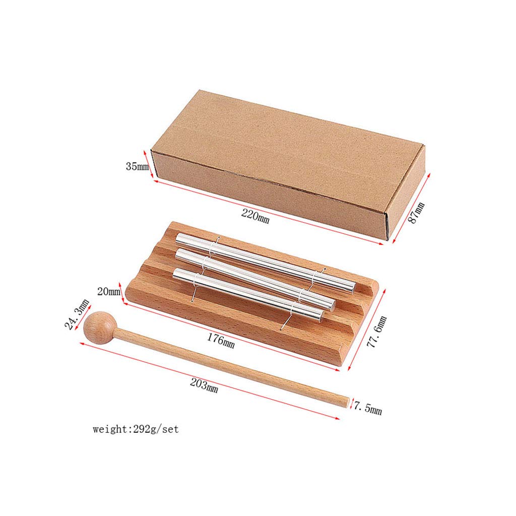 1.The Sound Of Nature:The chime has a pleasant sound,just need to gently tap the chime with the mallet so you can make a long-lasting surprise sound2.Good Vibration: The solid polished aluminum solid rod of the chime bell is 1 inch (2.5 cm) in diameter,5.6inch(14.3cm) in length,and the aluminum rod can vibrate for more than 20 seconds3.Meditation Chime:Deeper,richer and sustaining echo,good for meditation,yoga and sound therapy4.Classroom Chime: Clear "Ding"sound can effectively concentrate students'attention5.Beautiful gift:A nice musical gift for children to develop musical senseSpecifications:Size:8.7inch x 3.4inch x 1.3inch(22cm x 8.7cm x 3.5cm)Chime Material:AluminumWooden Frame Material:BeechDrumstick Material:BeechWeight:292gPackage included:1 x Three Tone Meditation Classroom Bell1 x Mallet