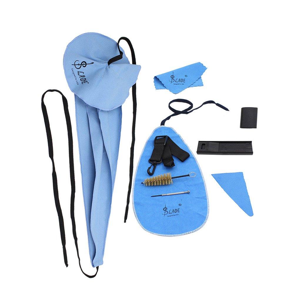 Features: Includes a sax neck strap, a reed case, a thumb rest, a mouthpiece brush, 4 cleaning cloth and a mini screwdriver. Simple adjustable length of high quality strap; Rubber thumb rest is designed to disperse the the weight into a wider space. Reed case provides protection for reed; A cleaning brush to clean the mouthpiece. 4 different types of cleaning cloth for cleaning different parts of saxophone; man-made chamois material, better to absorb water and oil. Designed for all sorts of saxophones and other wind instruments.Specifications: Color: Blue/ Yellow(optional) Material: Man-made Chamois, Nylon, Plastic and Rubber Item Size: Approx. 14 14 5cm / 5.5 5.5 2in Item Weight: Approx. 114g / 4oz Package Size: Approx. 15 15 6cm / 5.9 5.9 2.3in Package Weight: Approx. 116g / 4.1ozPackage List: 1 Neck Strap 1 Thumb Rest 1 Reed Case 1 Mini Screwdriver 1 Mouthpiece Brush 4 Cleaning Cloth
