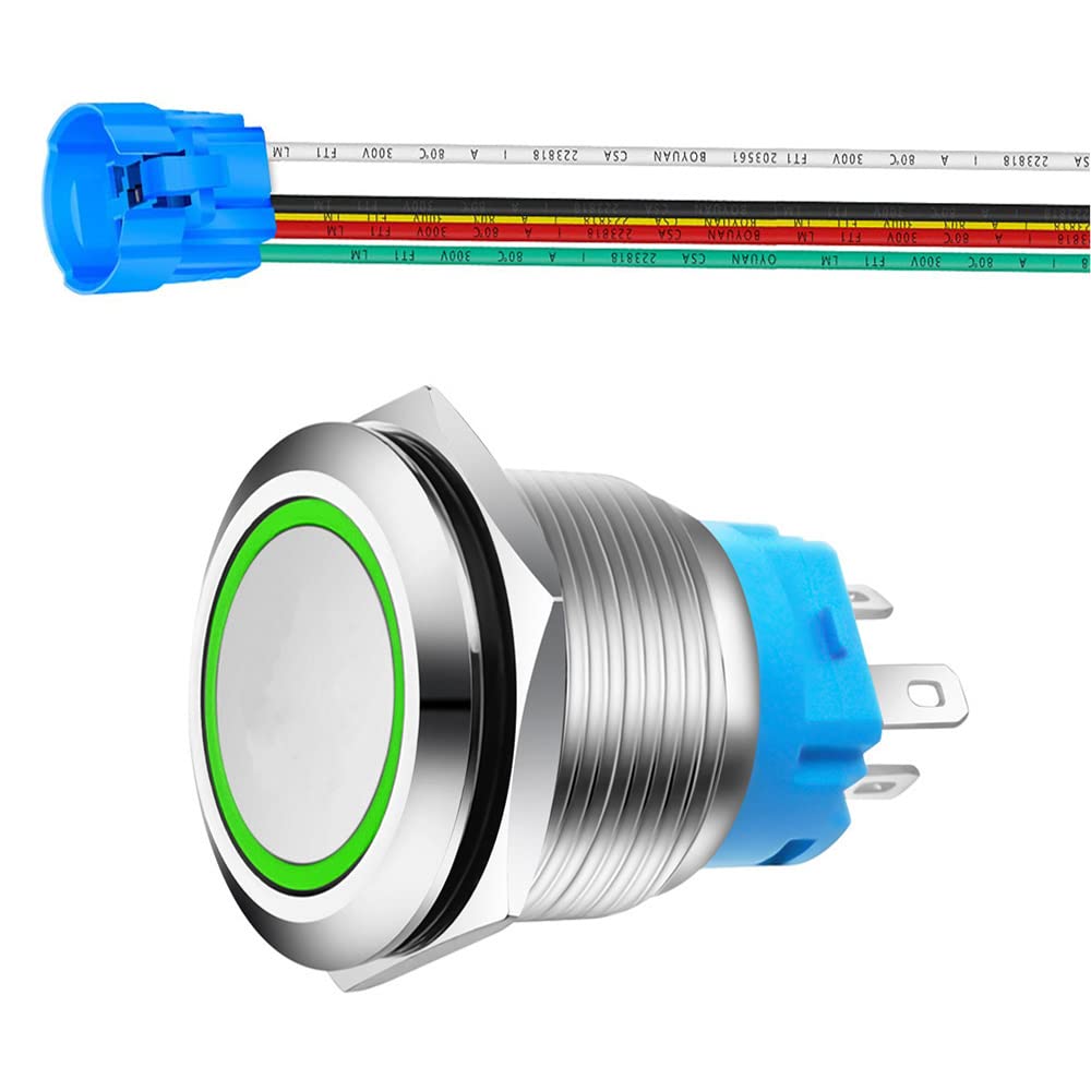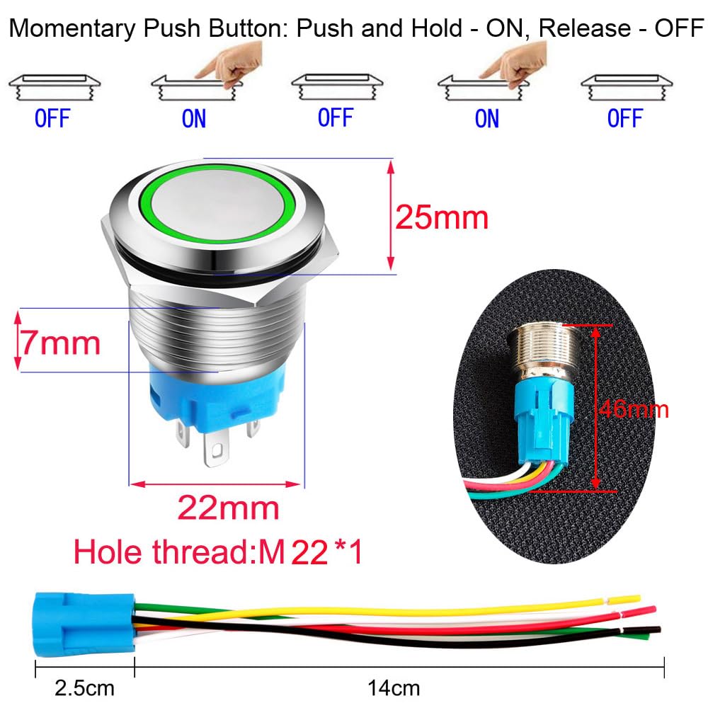 0.87 Inch/22mm Stainless Steel Momentary Push Button SPDT 110V-220V/3A LED 1NO1NC ON/Off Waterproof with Wire Socket Plug (Green LED) green /110-220V