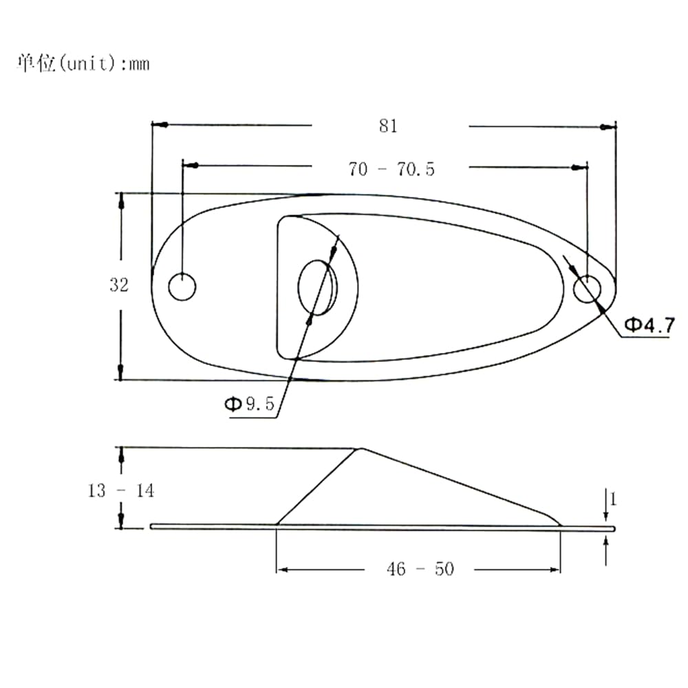 Length:81mm. Width:33mm. Screw Hole Distance:70mm. Material: Metal, durable and high precision. This is a mono Electric guitar output jack plate. Standard recessed oval plate The package contains: 1×Boat Style Jack Cover Plate