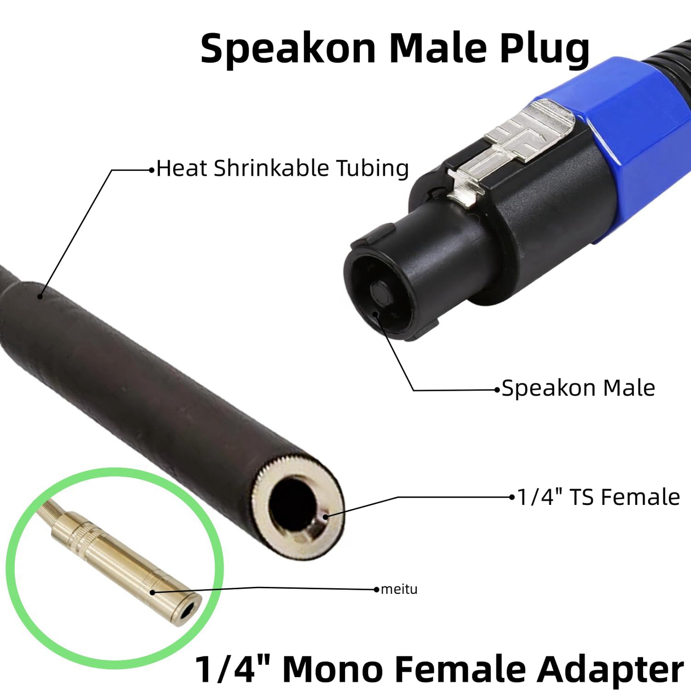 • speakon to speakon cable, 6.35mm Mono Jack adapter is designed to adapt an unbalanced Mic plug to a speaker input, For high current applications only, not for line level signals, Made of 99.99% high purity OFC oxygen-free copper.