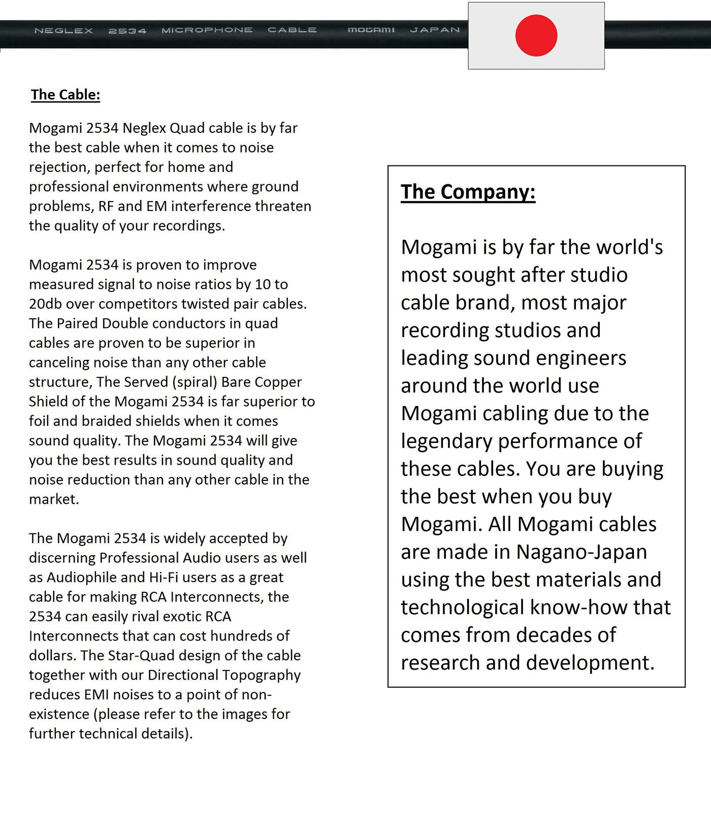 - The brand of wire we used for this custom cable assembly: Mogami, one of the most sought after Pro cable brands, preferred by major recording studios and leading sound engineers around the world. All Mogami cables are made in Nagano - Japan using the best materials and technological expertise of decades of R&D.