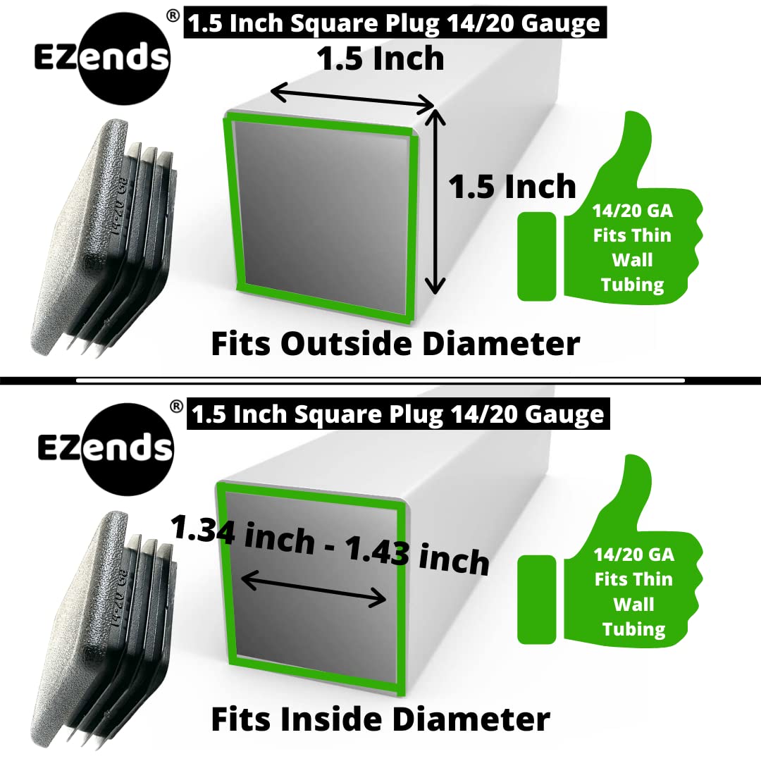 • IMPORTANT Only fits square tube inside diameter 1.34 inch - 1.43 inch Provides a flush sleek look when installed with square tube outside diameter 1.5 inch x 1.5 inch. Works with square tubing 14-20 gauge . Has proof of size (1 1/2 x 1 1/2 - 14-20 GA) embedded on the side of plug