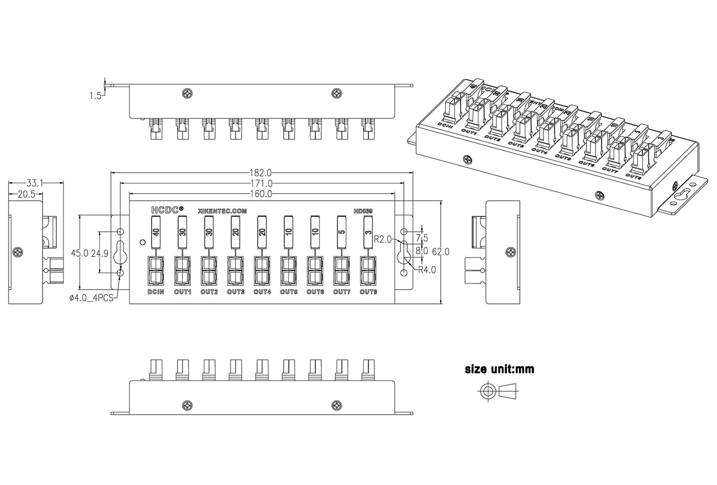 • Operating voltage: 0 to 32VDC, No-load current: 2mA(for power indicator LED). Input port: maximum input current 40A, fuse 40A. Output port: 8 output ports, fuse 30A*2, 20A*2, 10A*2, 5A*1, 3A*1.