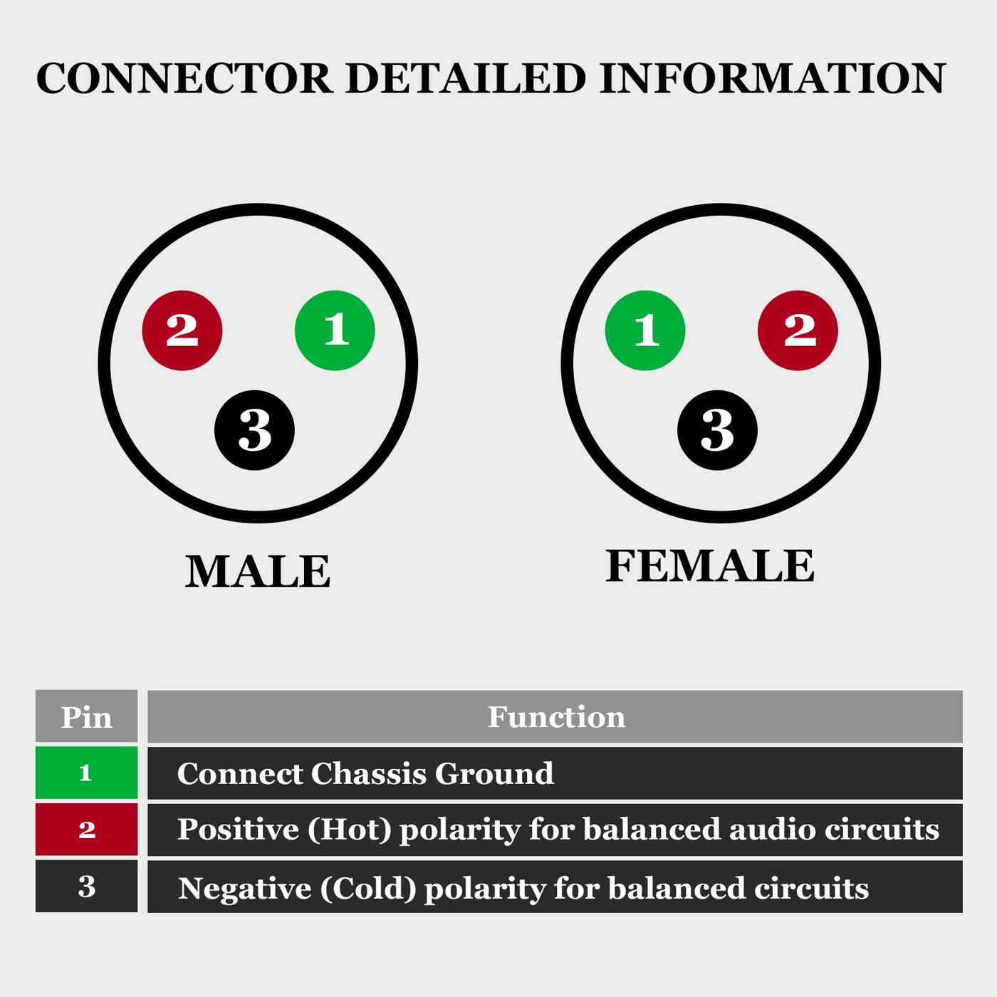 - 3 Pin XLR Male to Female Connection The cable has a 3 pole XLR male connector on one end and a right angle female on the other. Balanced XLR connection is functioned to allow various professional audio devices to connect to each other.