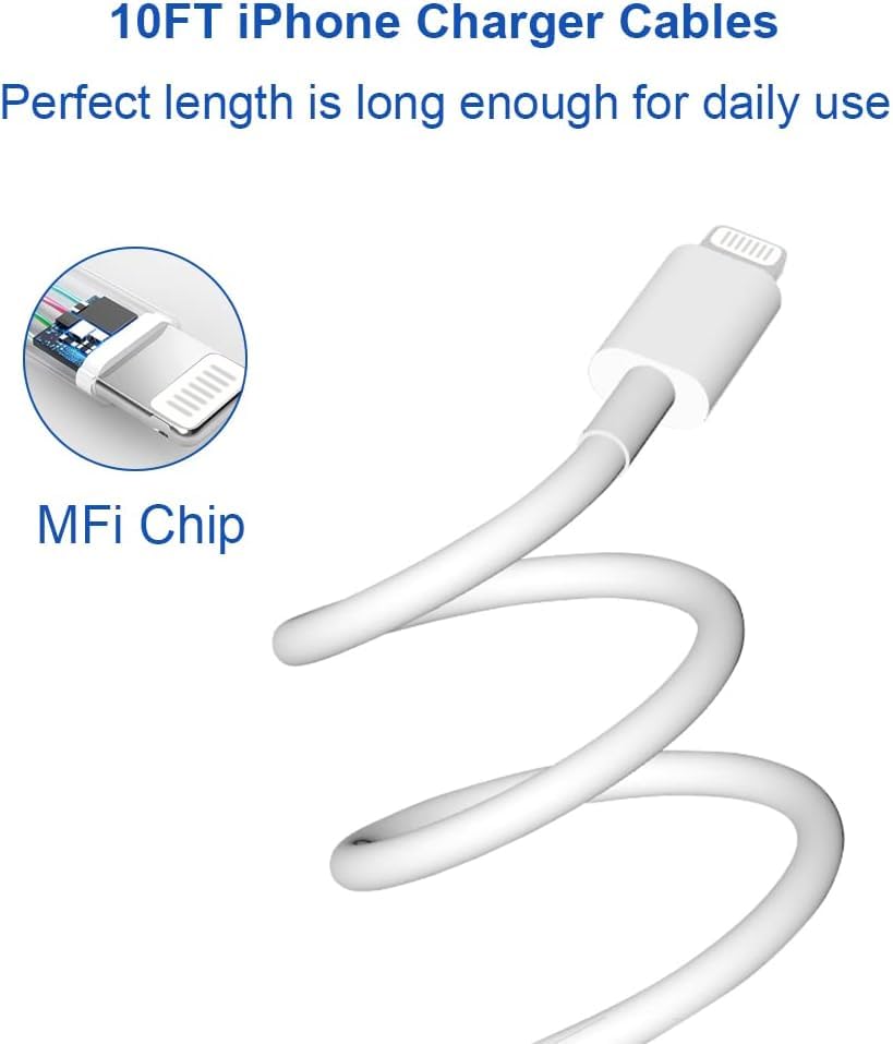 - [iPhone Charger cargador] The 10FT iPhone 14 13 12 11 fast charging cables is long enough to allow you to charge your iPhone/ipad from extra long distance, make your life easier and more convenient. With the 10ft length, you can lie on the couch or sofa and use your devices while you are charging at the same time. And you can use freely in your bedroom, office or in the backseat of your car.High quality cables guarantee durability and flexibility