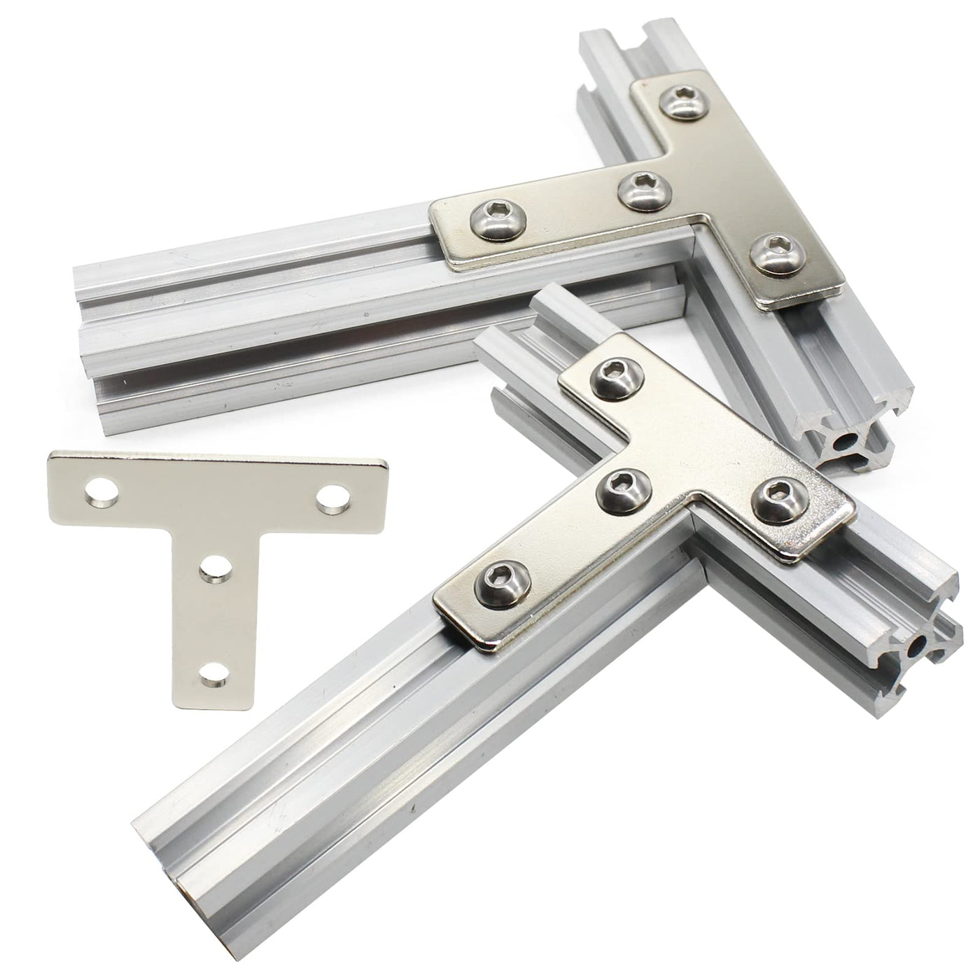 Package include: 10pcs aluminum extrusion T shape joint plate. 40pcs screws, 40pcs nuts.It's thick enough to support your project, Material: stainless steel. Fit 20x20 series Aluminum extrusion profile, Used to connect pieces of 20mm aluminum extrusion at a 90 degree angle.