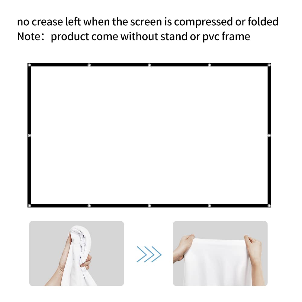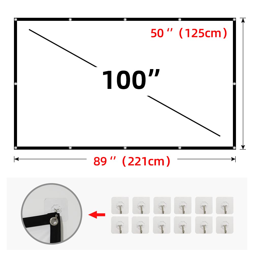 - Projector Screen 100 Inch:Made with natural Polyester fabric that The projection is sharper and brighter than most other projection screens, The Projection Screen are thicken and smooth.Supports 3D, HD movies, high color reflection. Format: 16: 9, Display area: 221x125cm / 89"x50" fits for living rooms or backyard. Comes with 1 100 inch projector screen , 2 * 5 meters ropes and 14 pcs hooks.