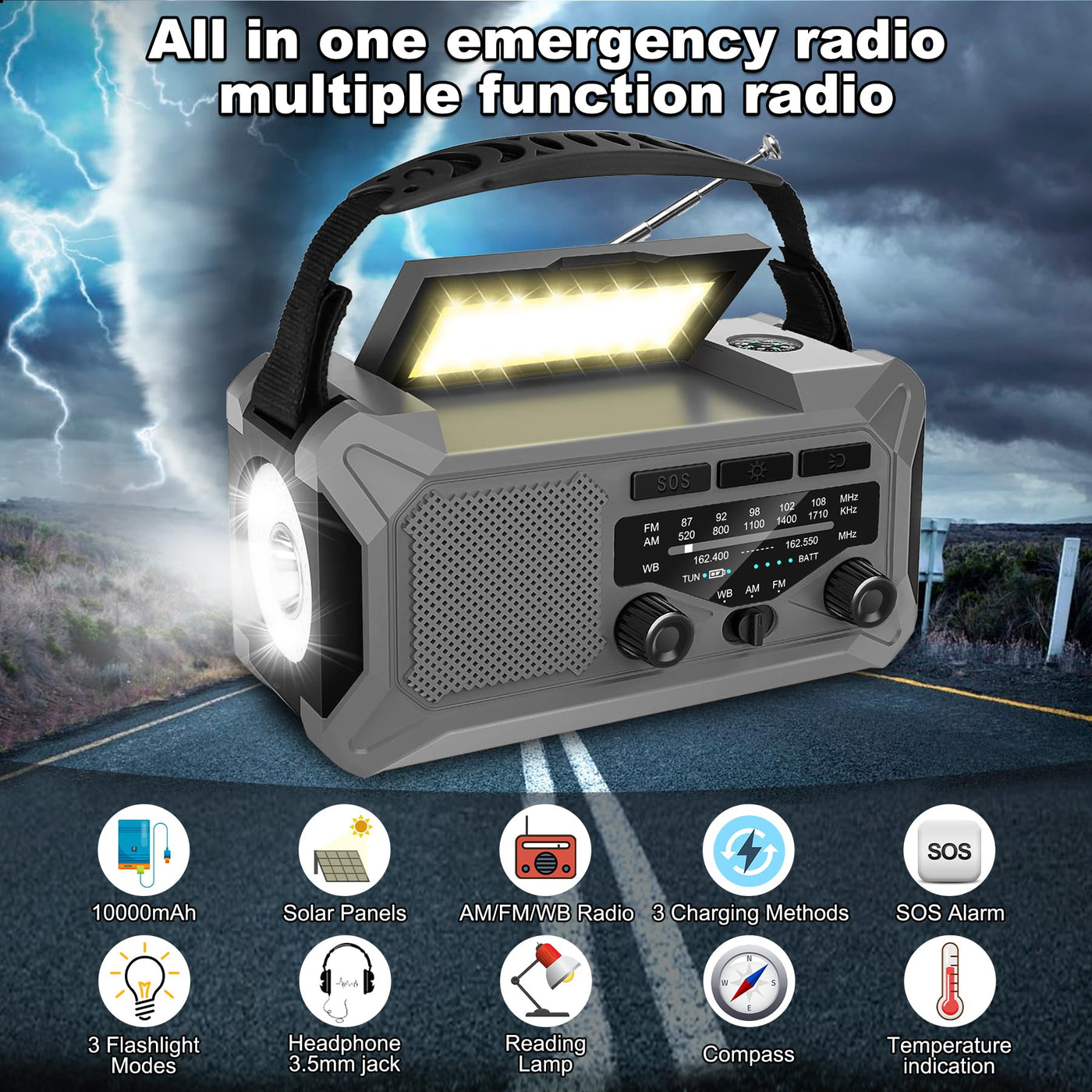 - 7-in-1 Emergency Radio: Beyond its emergency radio function, this solar-powered radio with a manual crank boasts a variety of practical features.13 Flashlight Modes,23 Brightness Reading Lights,3Emergency Alarm Function,4Compass,5Thermometer,610000mAh Mobile Power. Your go-to companion for camping and outdoor sports, this NOAA weather alert radio ensures safety and reliability. For avid outdoor enthusiasts, this multifunctional emergency weather radio is a must-have.