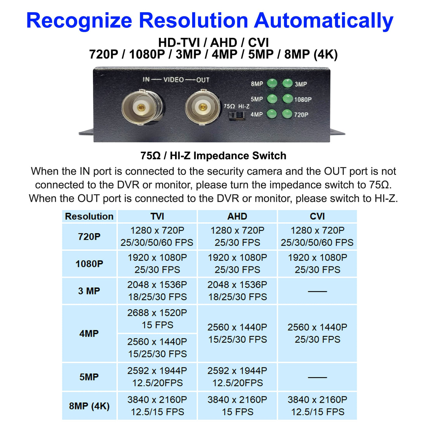 - Recognizes HD-TVI/AHD/CVI V4.0 Resolution Automatically. HD-TVI & CVI from 720P @25/30/50/60 FPS up to 4K (3840x2160P) @12.5/15 FPS, and HD-AHD from 720P @25/30 FPS up to 4K (3840x2160P) @15 FPS. CVBS up to 1000TVL. Please check the picture for the Resolution Table.