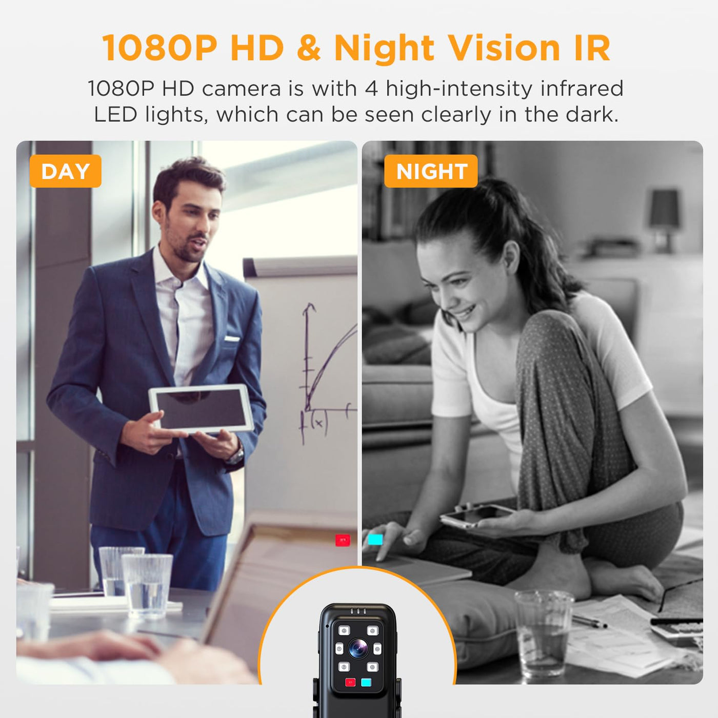 - 1080P HD Video with Night Vision1080P video recording and 40MP photos, the lightweight body camera with clip could provide clear footage in daily life, also the body camera with audio recording could work at night, 4pcs invisible IR lights help to record in the dark environment