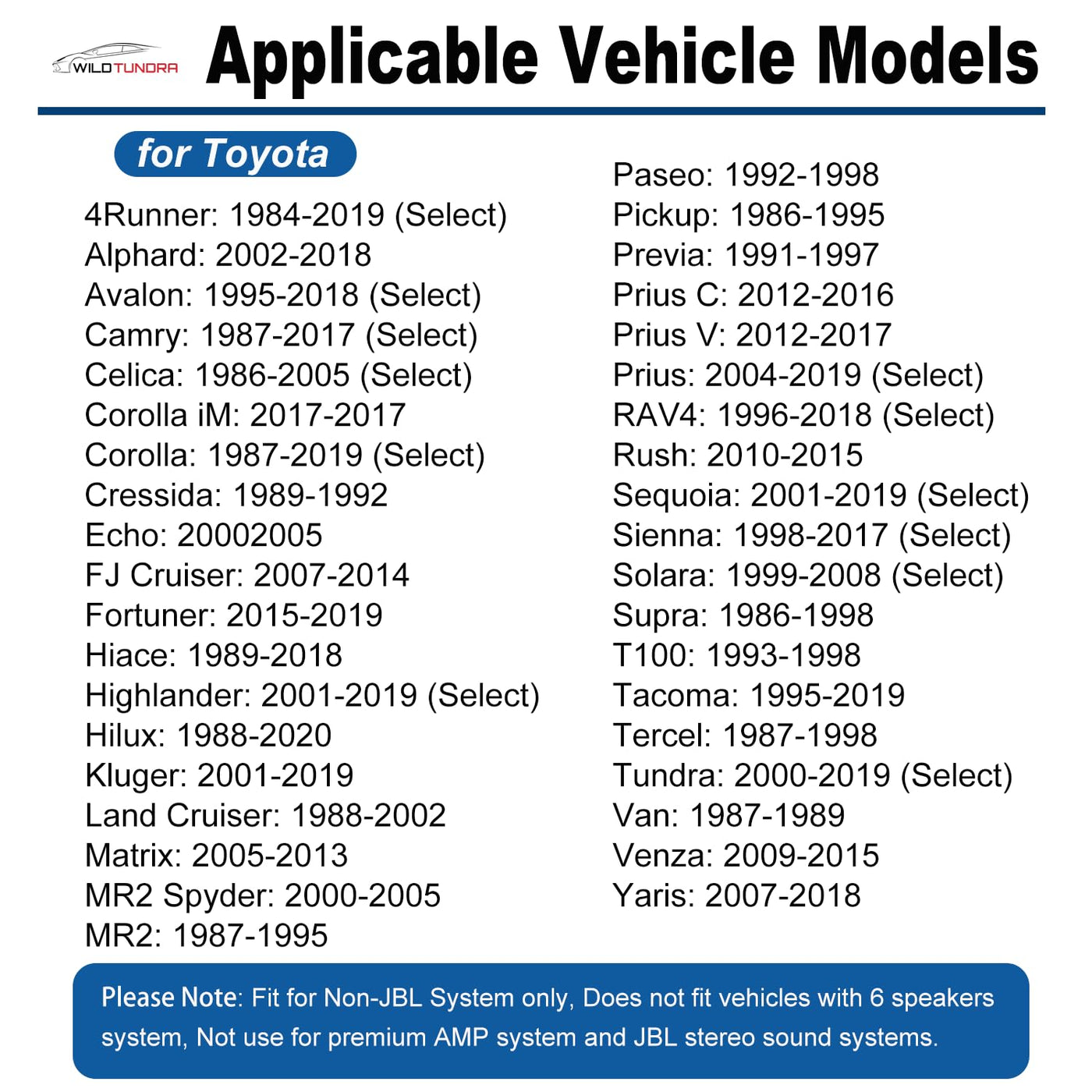 - Car Radio wiring harness compatible with Toyota(Non JBL), 4Runner, Alphard, Avalon, Camry, Corolla iM, Corolla, Cressida, Echo, FJ Cruiser, Fortuner, Hiace, Highlander, Hilux, Kluger, Land Cruiser, Matrix, MR2 Spyder, MR2, Paseo, Pickup, Previa, Prius C, Prius V, Prius, RAV4, Rush, Sequoia, Sienna, Solara, Supra, T100, Tacoma, Tercel, Tundra, Van, Venza, Yaris, 2019 and below. Pease check your vehicle is listed or not before order.
