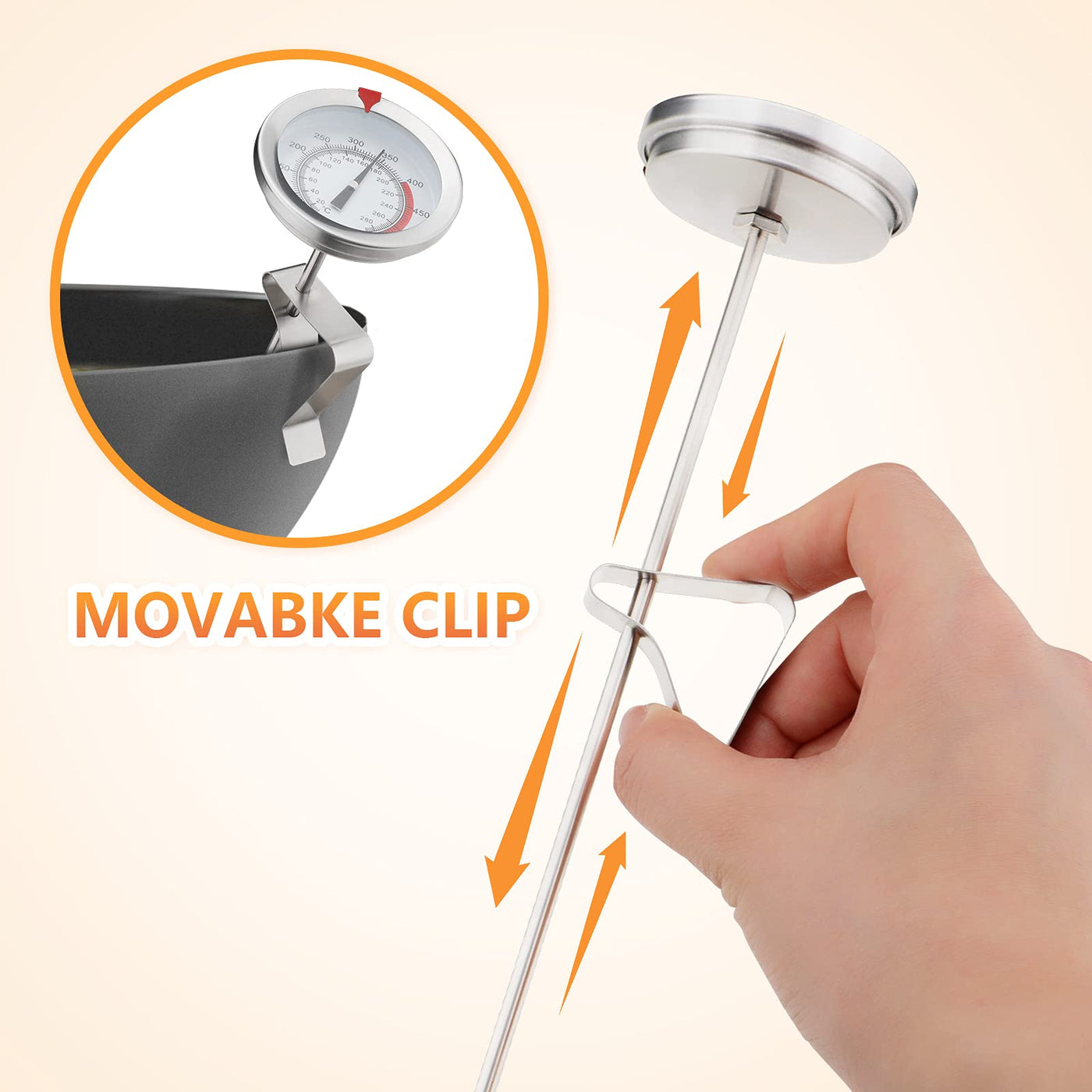 - EQUIPPED WITH A CLIP: The adjustable clip fits on an extra-long, 12-inch stem for secure attachment and prevents you from touching the bottom of the pot.