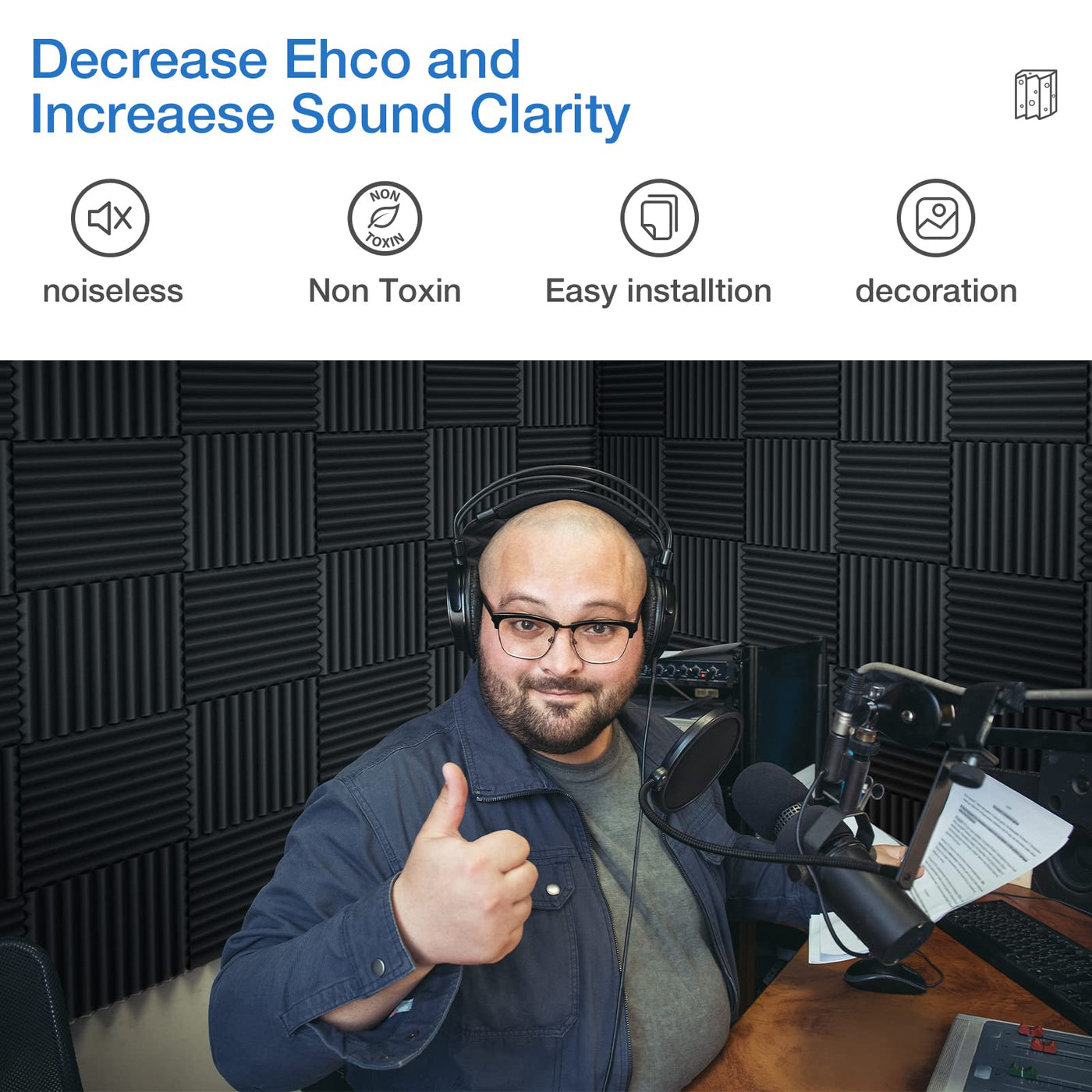 • Quick Installation& Materials SafetyOur acoustic panels are lightweight and can be installed to a variety of different surfaces (walls,doors,windows,ceilings and so on). The acoustic foam is also easy to cut to size, altering wont affect acoustic foam's performance. They are made by non-toxic materials and No any risk when you stay in a room with Acoustic Foam for a long time.